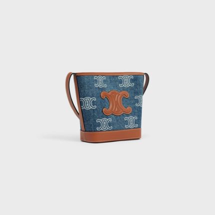 MINI BUCKET CUIR TRIOMPHE IN DENIM WITH TRIOMPHE ALL-OVER EMBROIDERY AND CALFSKIN
