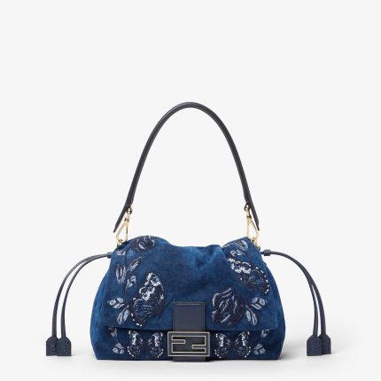 FENDI Mamma Baguette Medium Blue flocked denim bag with Night Butterfly embroidery