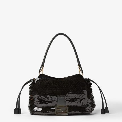 FENDI Mamma Baguette Medium Black crochet bag with maxi sequins