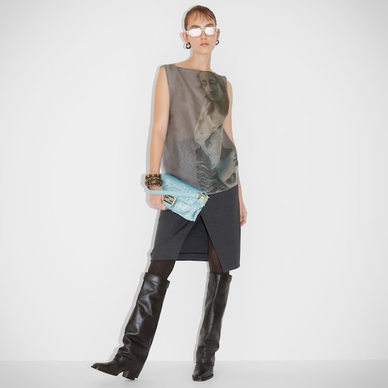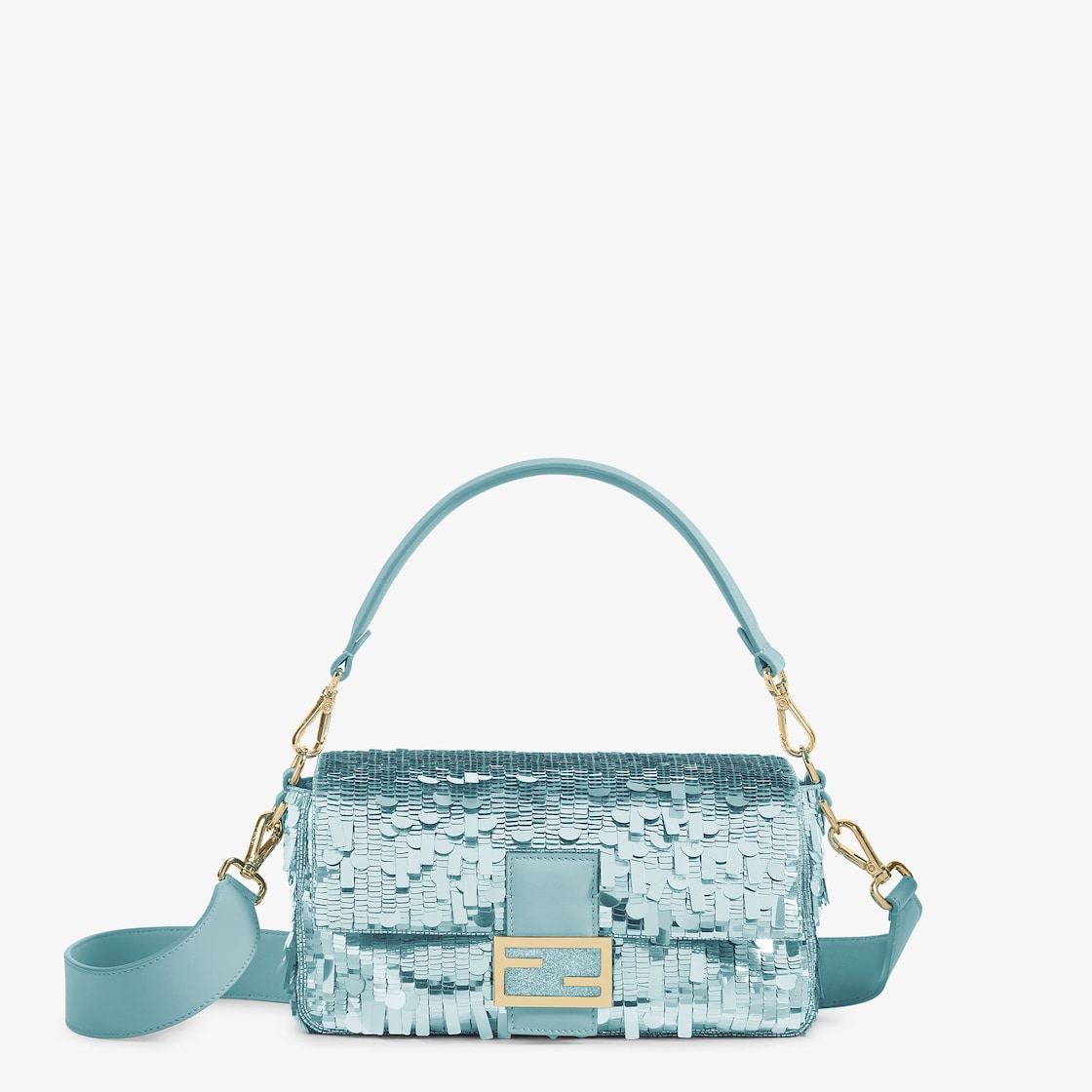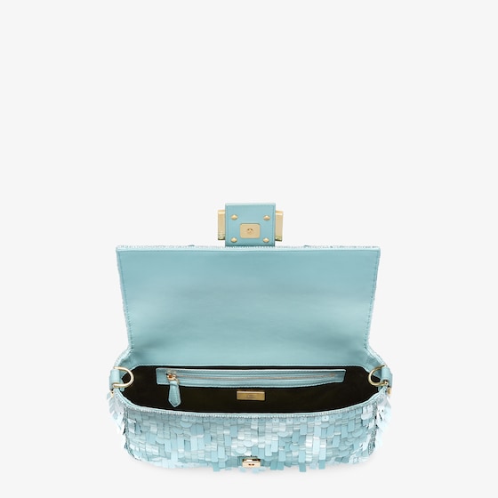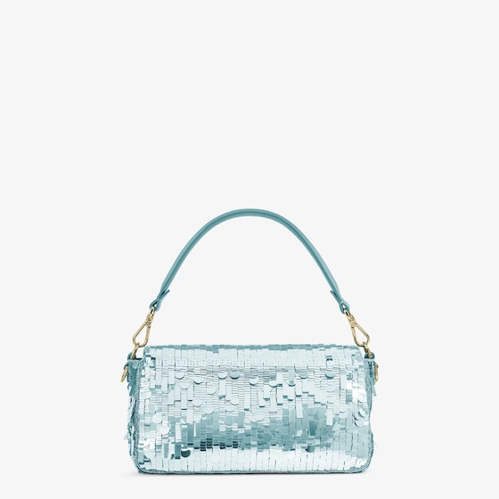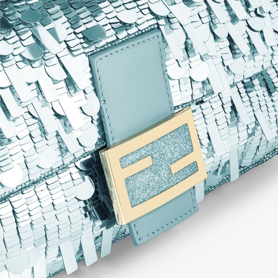 Hand-embroidered with light blue sequins of different shapes and sizes. Embellished with tone on tone calfskin details and decorated with an FF clasp.
