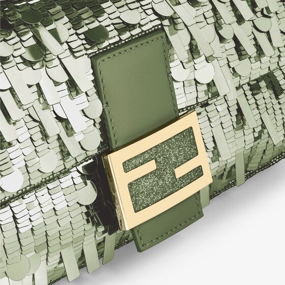 Hand-embroidered with green sequins of different shapes and sizes. Embellished with tone on tone calfskin details and decorated with an FF clasp.
