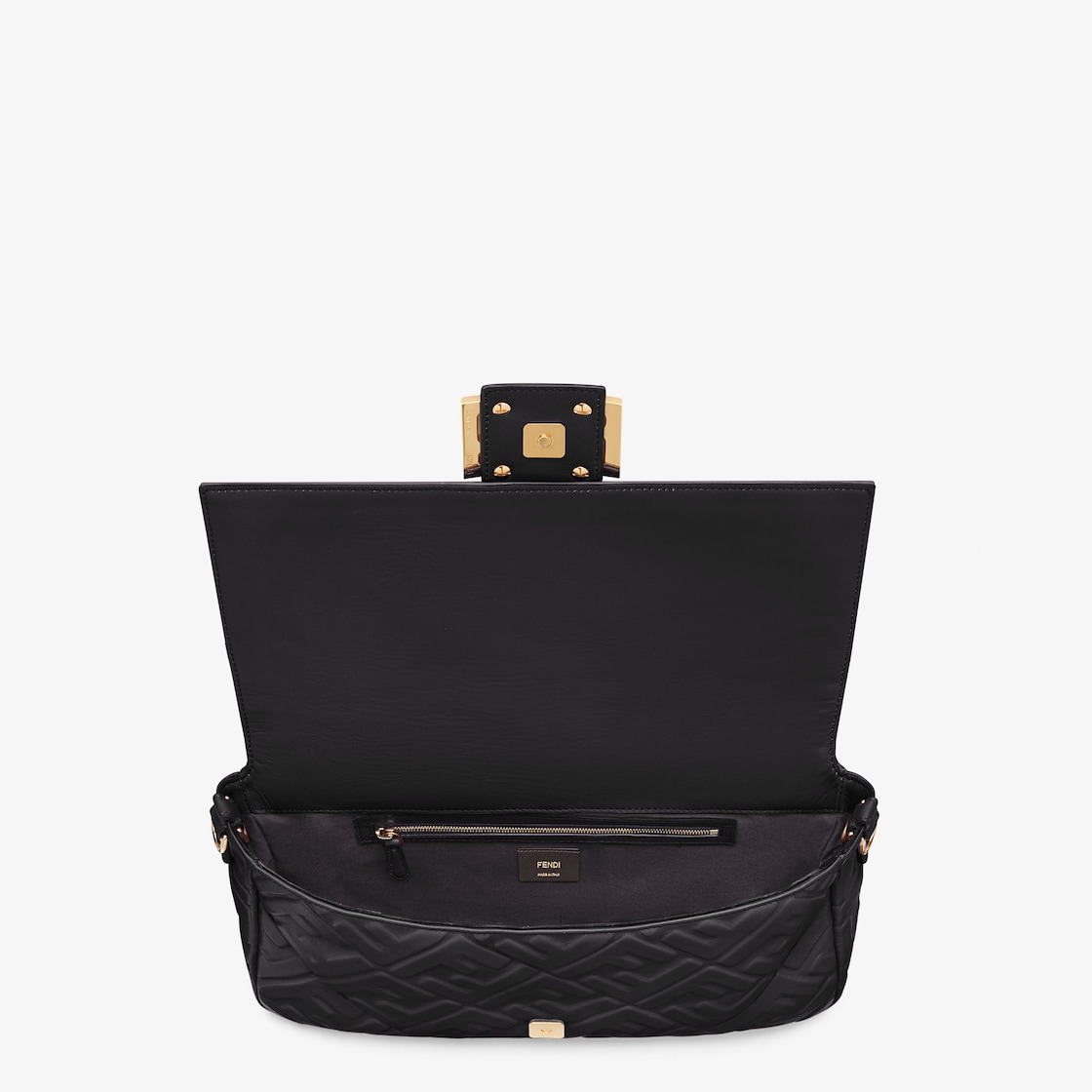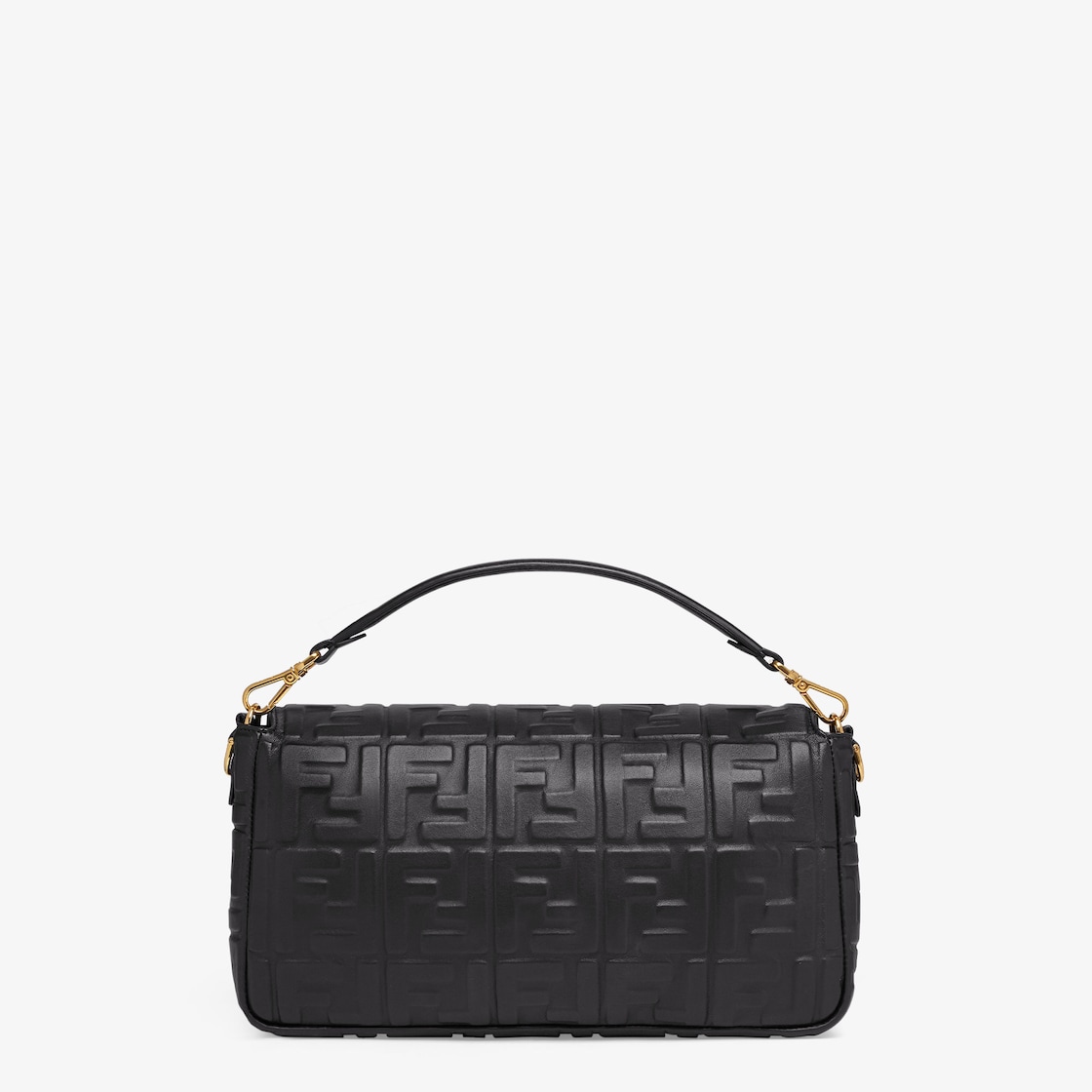 Iconic large Baguette bag made of black soft nappa leather with a three-dimensional texture FF motif. Decorated with an FF clasp.