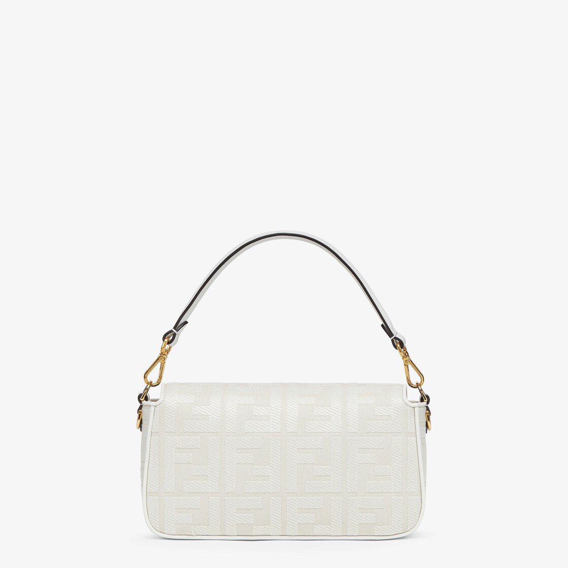 Iconic medium Baguette bag made of white canvas with an raised FF motif created with tone on tone embroidery, trimmed in leather and adorned with an FF clasp.