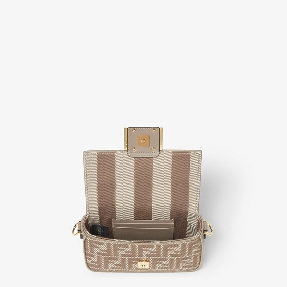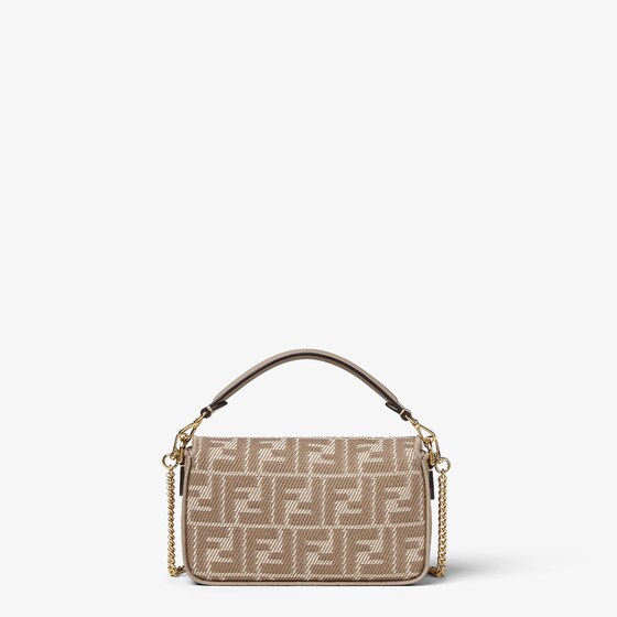 Iconic small Baguette bag made of denim-effect FF jacquard in shades of dove gray. Embellished with FF clasp and tone-on-tone leather details.