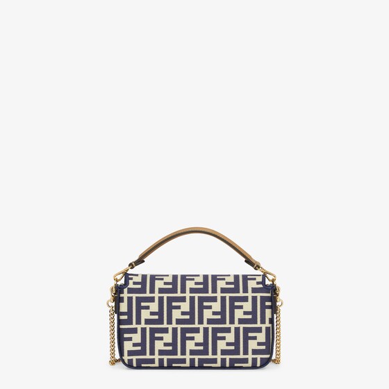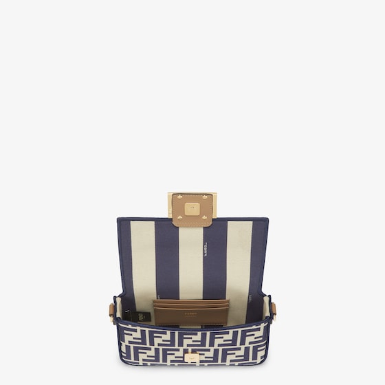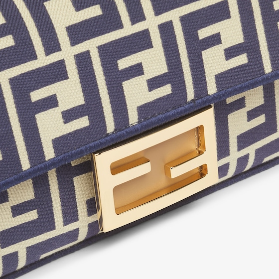 Iconic small Baguette bag made of jacquard fabric with the iconic FF motif in shades of blue, embellished with blue embroidered borders, beige leather details and embellished with an FF clasp.