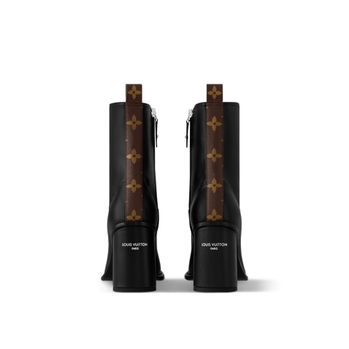 The Berlin ankle boot is crafted from supple calf leather for a stretchy, second-skin effect. The upper is complemented by an equally sleek, leather-covered heel in the shape of a half-Monogram Flower, which is embossed with the Louis Vuitton signature. This model was a highlight of Nicolas Ghesquière’s 10th anniversary show for the House.