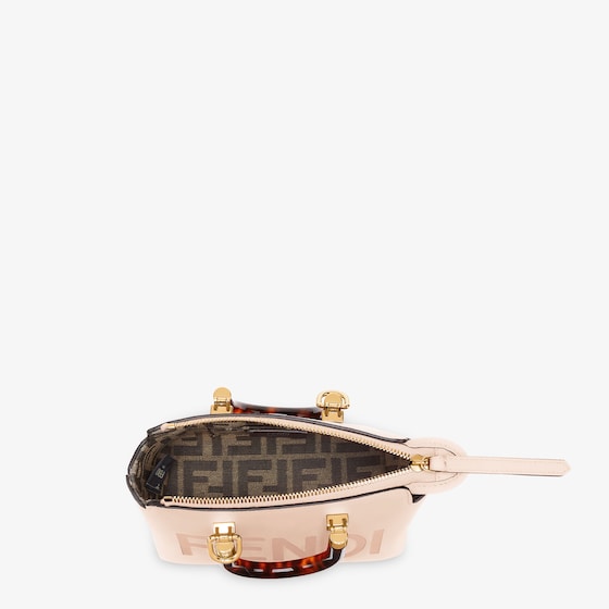 Iconic mini By The Way Boston bag made of light pink leather with hot-stamped FENDI ROMA lettering and rigid tortoiseshell-effect plexiglass handles. Zip fastening.