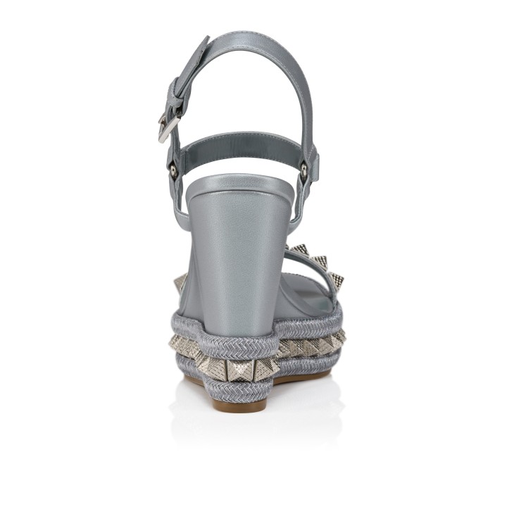 The Pyraclou sandal has a glamorous edge, featuring a row of signature pyramid-shaped spikes that circle its 110 mm wedge heel and enhance its slim straps. This summery model from Maison Christian Louboutin boldly reveals the foot and is crafted from iridescent Manuka green lamb nappa leather. This model fastens with an ankle strap that has a metal clasp.