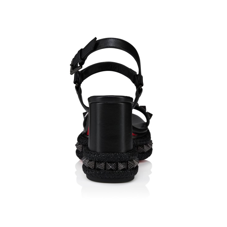 The Superaclou receives a new 85 mm heel height this season. Crafted from black lamb nappa leather, the toe and ankle straps are adorned with mini pyramids and the sole is crafted from spikes and rope, evoking an Eastern theme. The iconic Maison Christian Louboutin Loubi red sole adds the finishing touch to this contemporary sandal.