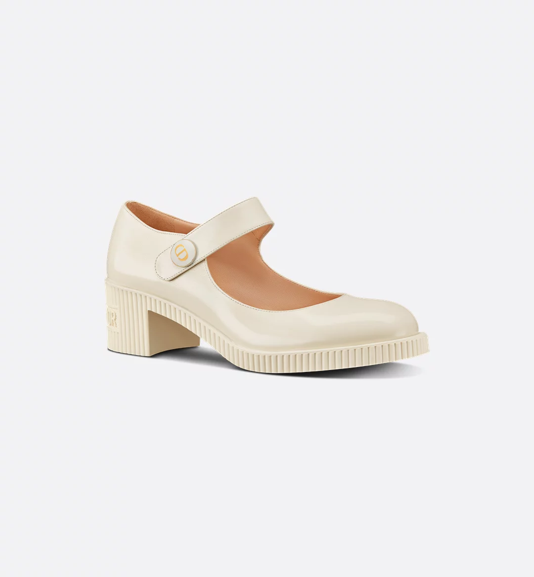 The D-Doll pump offers a new take on the classic Mary Jane in a Maria Grazia Chiuri variation. The white shiny calfskin style is embellished with a tonal enamel button with a gold-tone ‘CD’ signature. The ‘CHRISTIAN DIOR’ rubber block heel lends a relaxed touch to the elegant shoe.
