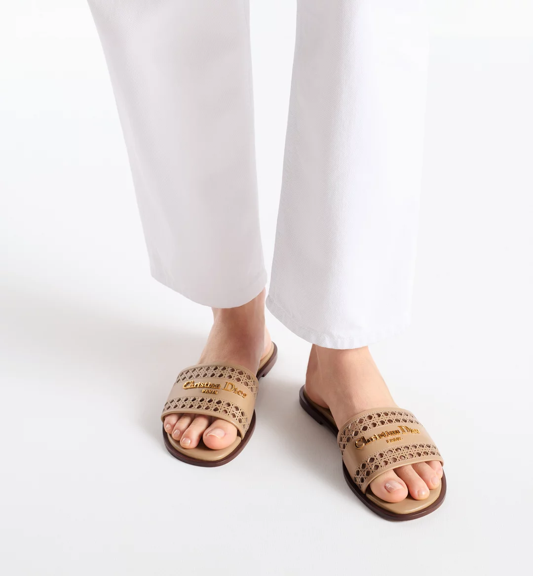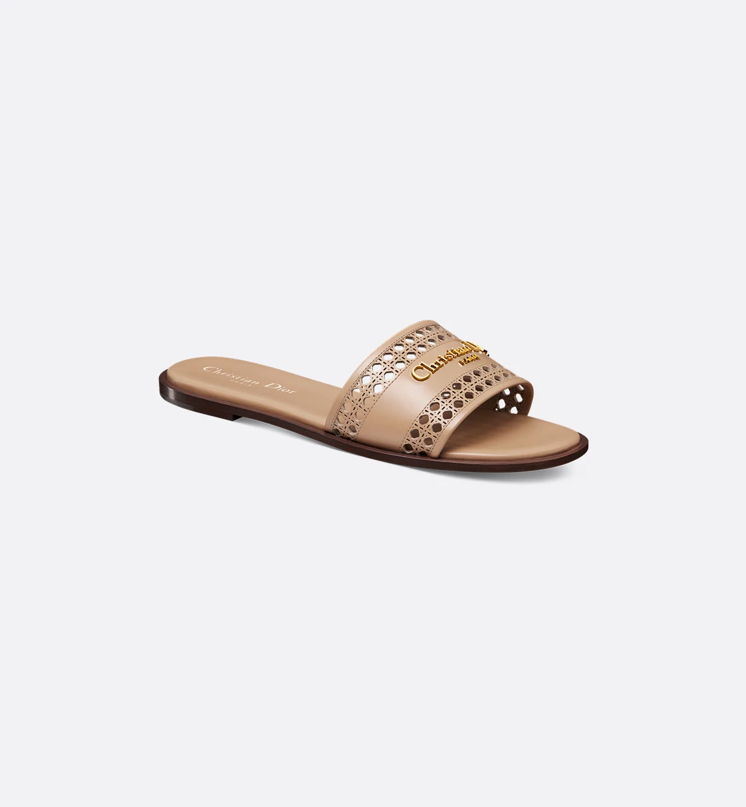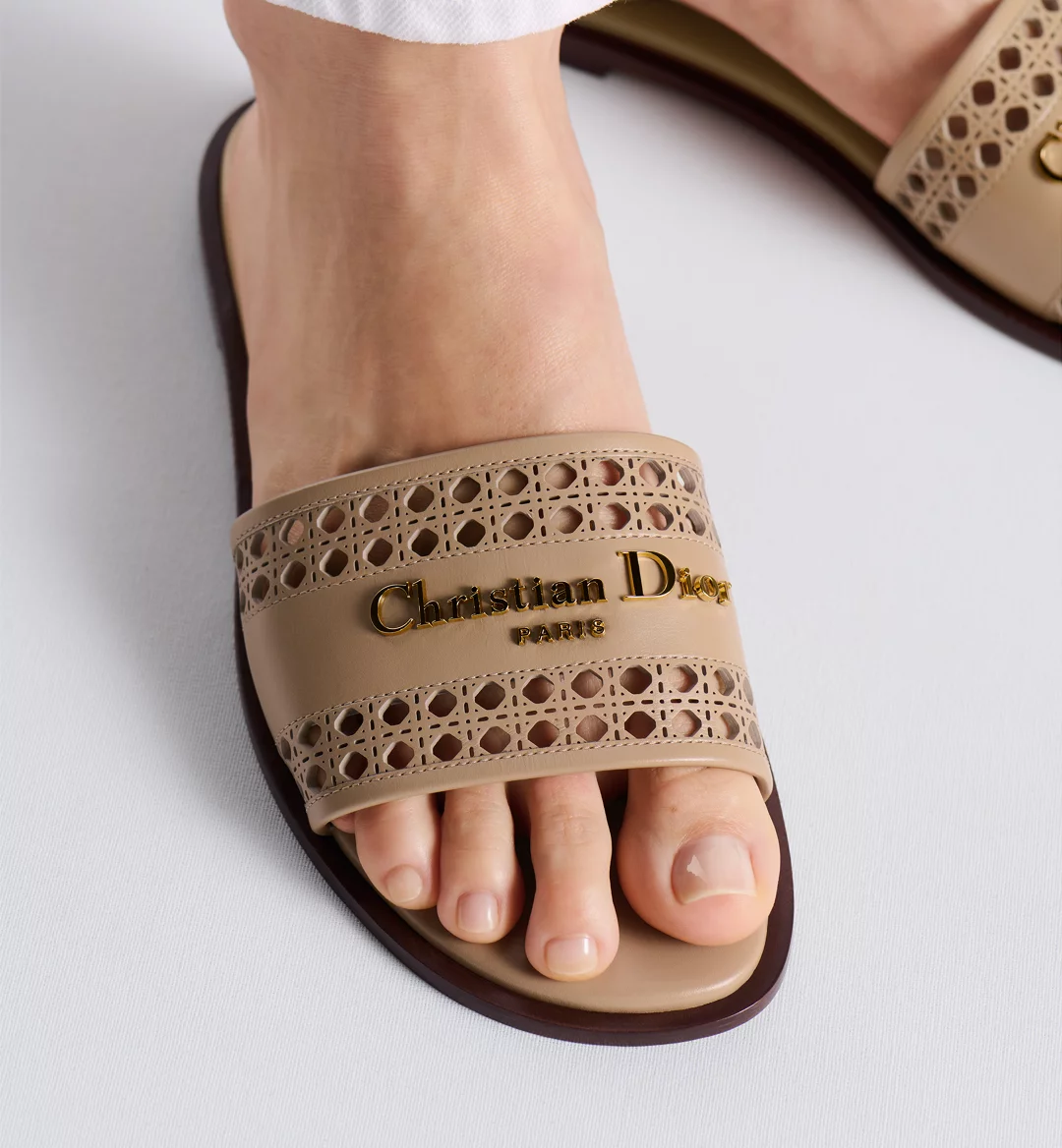 The D-Lane slide is an emblematic style with a timeless look. The beige openwork Microcannage calfskin upper is adorned with a gold-finish metal Christian Dior Paris signature, adding an instantly recognizable touch. The padded leather insole offers ultimate comfort while the streamlined design makes it easy to slip on for a laid-back look.