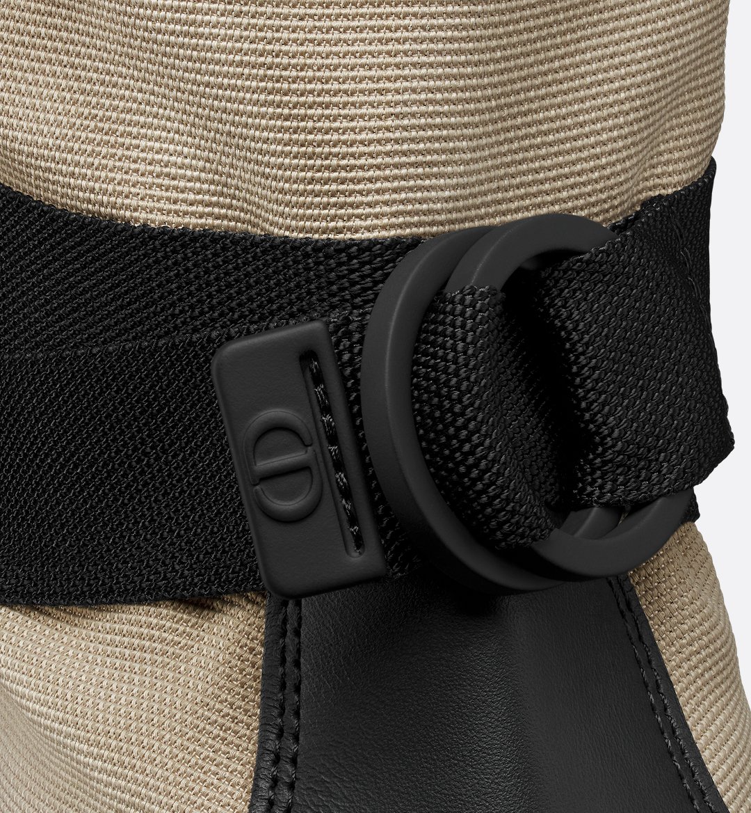 The D-Major boot is an elegant and assertive creation. The style combines warm taupe technical fabric with black calfskin and showcases the black Miss Dior Graffiti motif, a nod to the 1967 debut ready-to-wear collection and a manifesto to Maria Grazia Chiuri’s signature celebration of feminism. The CD initials on the adjustable strap and a notched sole complete the boot.