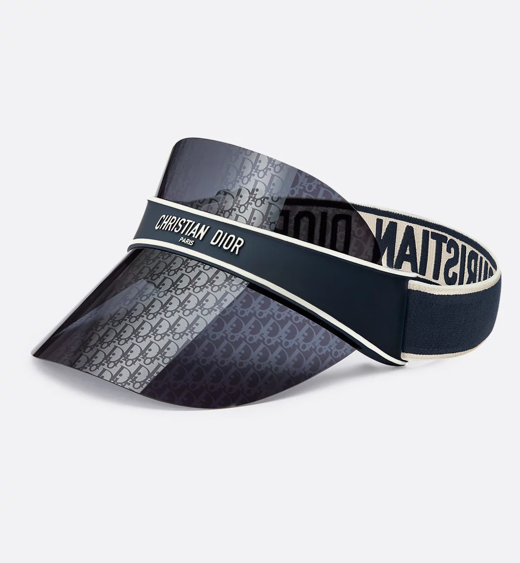 The DiorClub V1U visor is distinguished by its innovative design and sportswear look. The white Christian Dior Paris signature contrasts with the navy blue matte structure, echoing the jacquard stretch band. The design, completed by a blue and silver-tone Dior Oblique visor, is a statement piece with decisively Dior style.