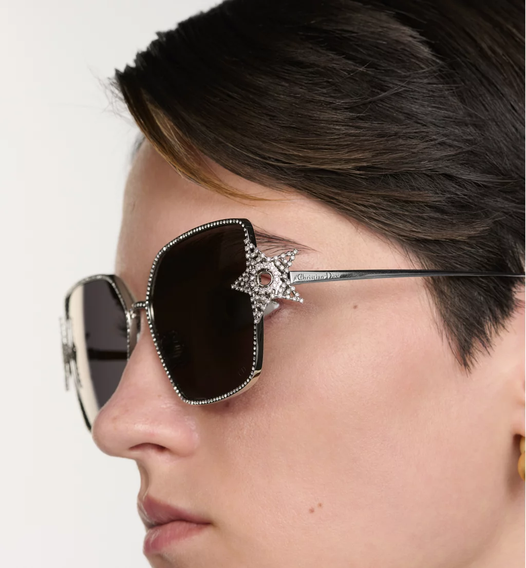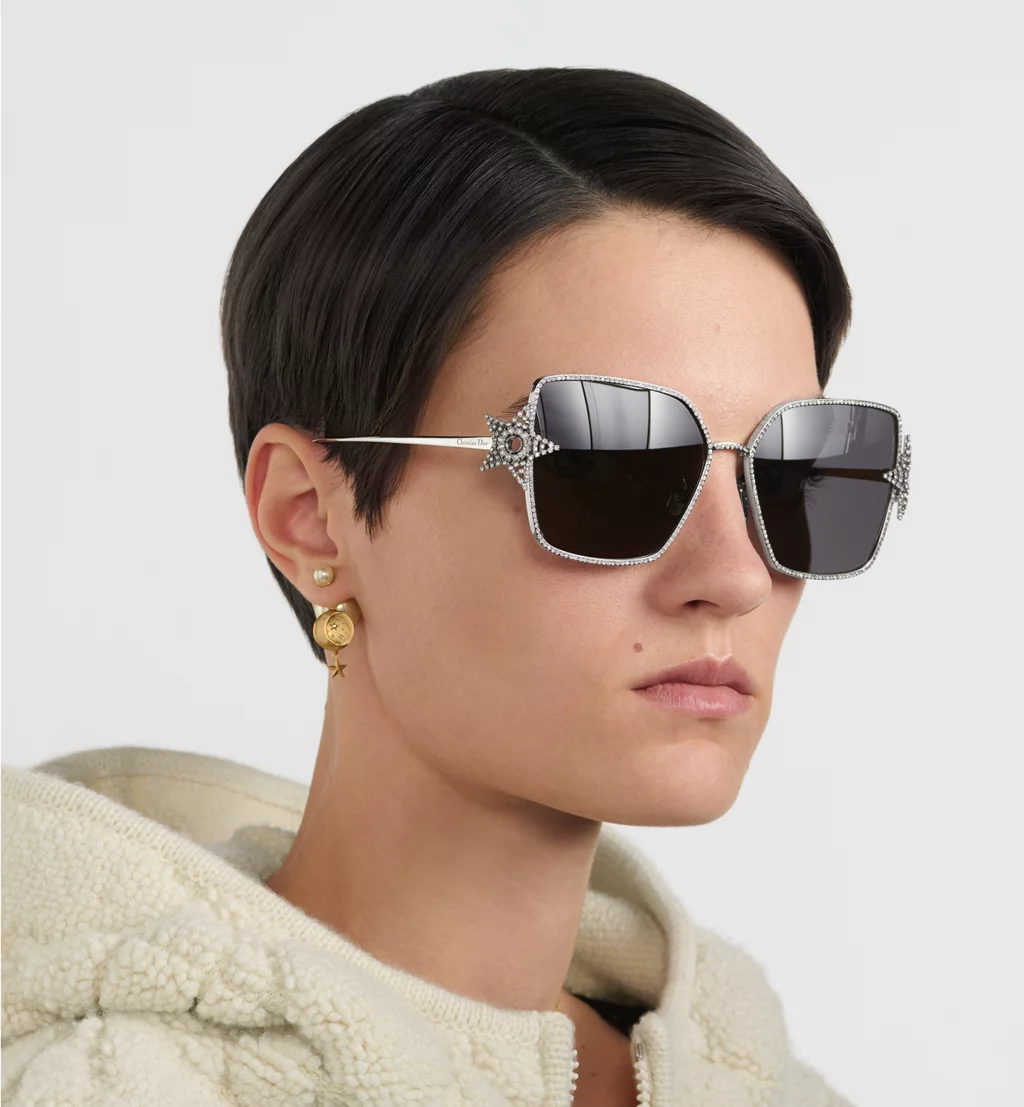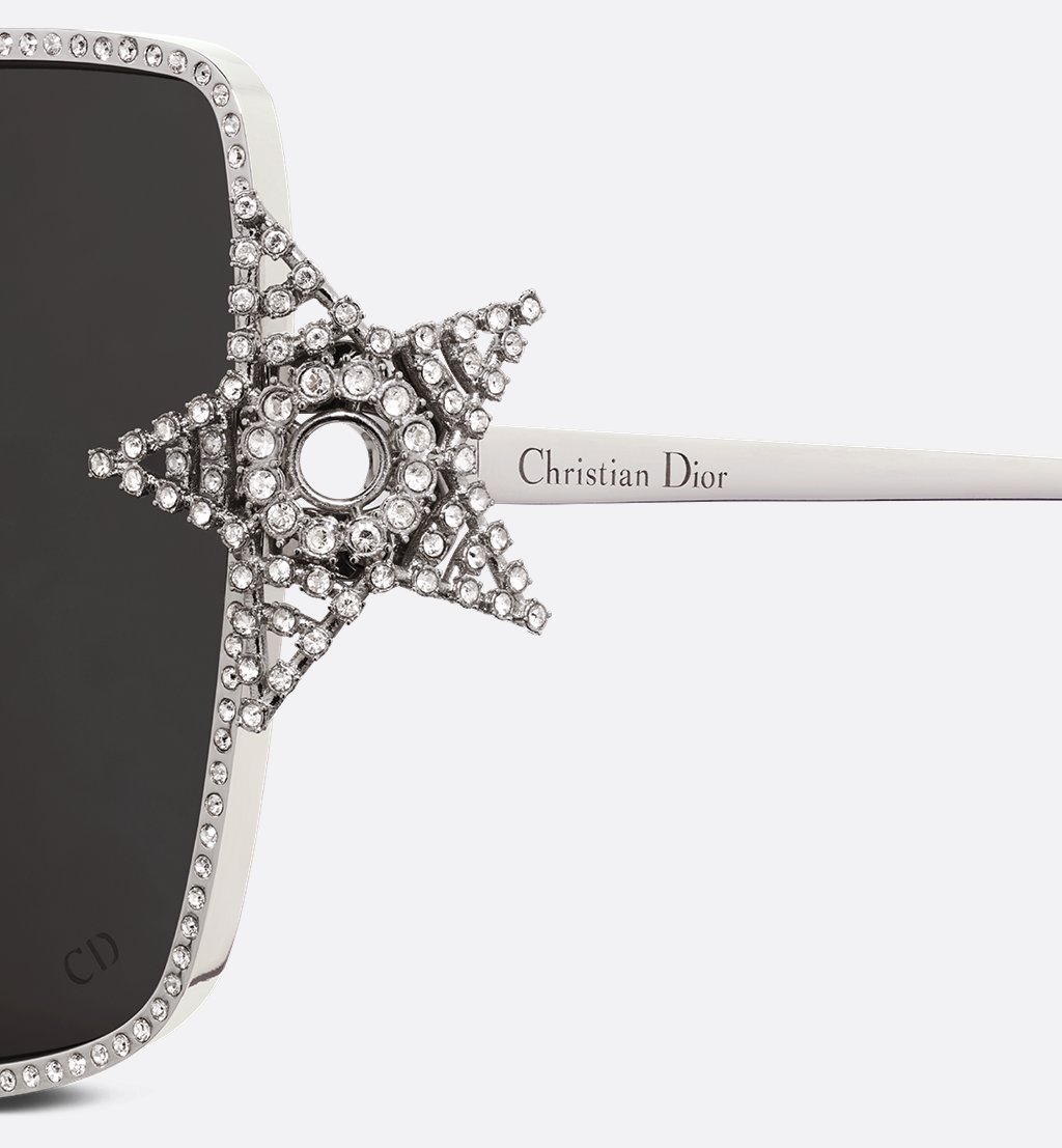 The DiorÉtoile S1U sunglasses mark the House’s exclusive new line with an elegant and refined look. The square silver-finish metal frame is embellished with Swarovski® crystals adorning the rim of the deep gray lenses, as well as the star on the hinge. Completed by thin temples engraved with the Christian Dior signature, the jeweled sunglasses will lend a bold touch to any look.