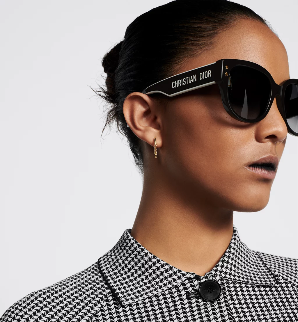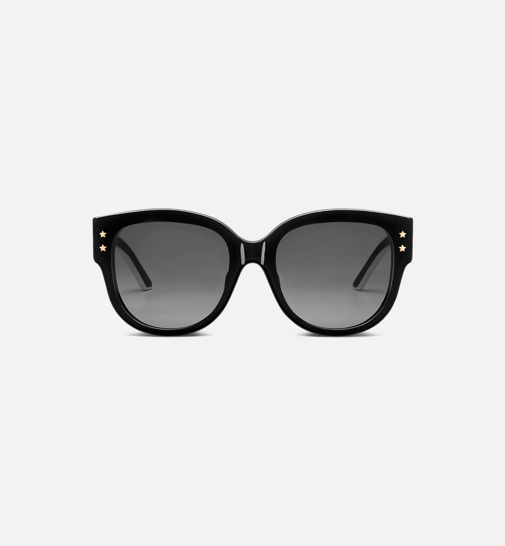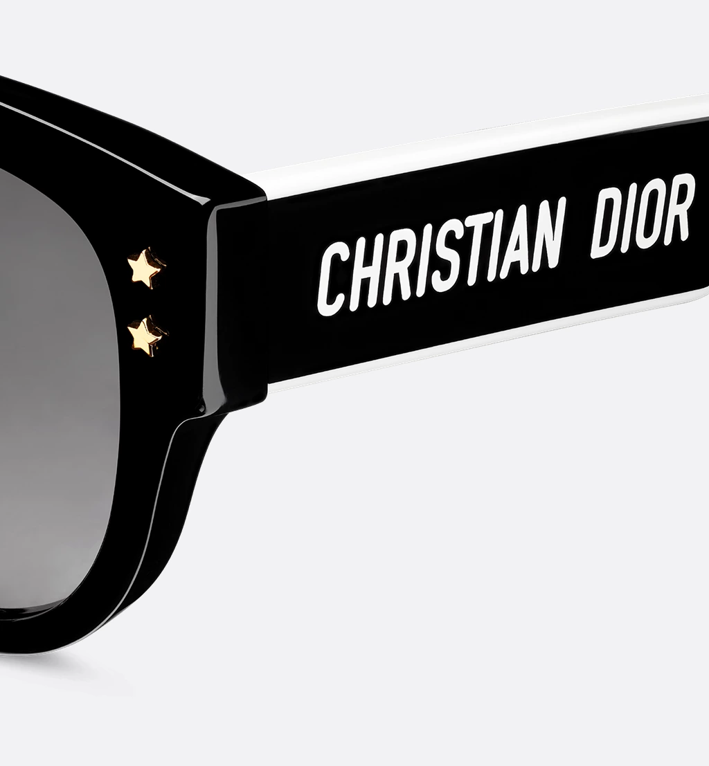 The DiorPacific B2F sunglasses are a modern butterfly design. The black acetate frame is adorned with gold-finish star details on the front, while the acetate temples present a black and white double-layer effect showcasing the Christian Dior signature. Completed by gradient gray lenses, the new essential style will lend a contemporary touch to any look.-