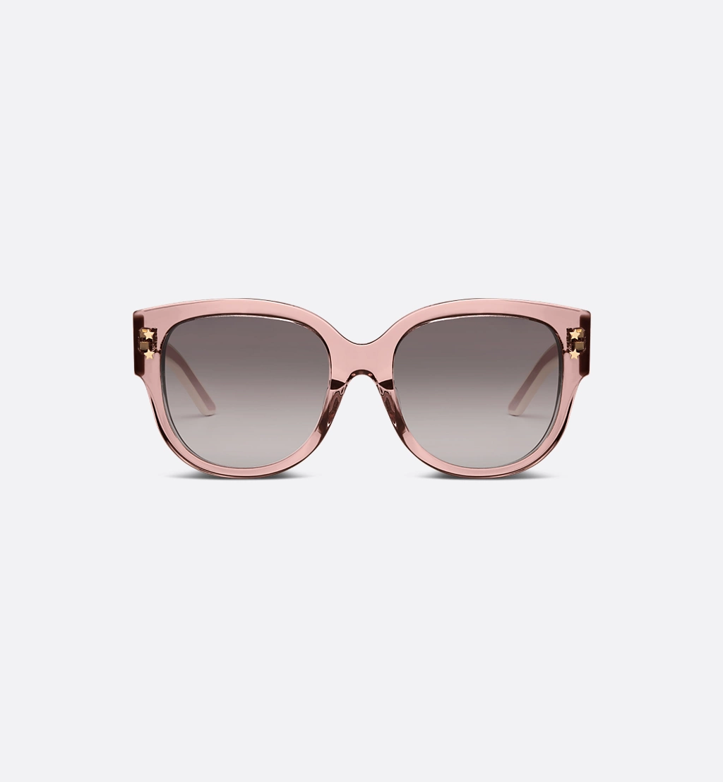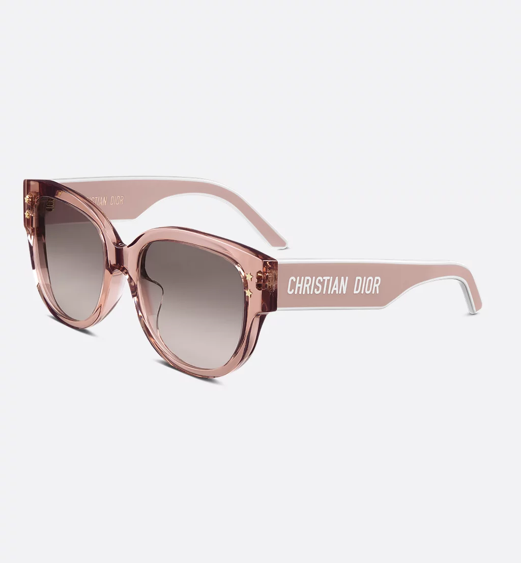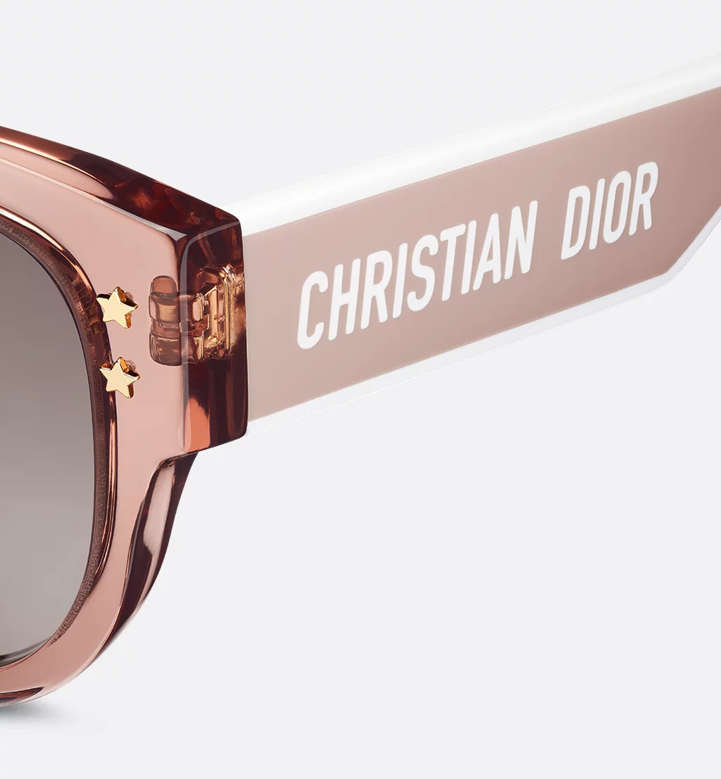 The DiorPacific B2F sunglasses are a modern butterfly design. The transparent pink acetate frame is adorned with gold-finish star details on the front, while the acetate temples present a pink and white double-layer effect showcasing the Christian Dior signature. Completed by gradient gray-to-purple lenses, the new essential style will lend a contemporary touch to any look.