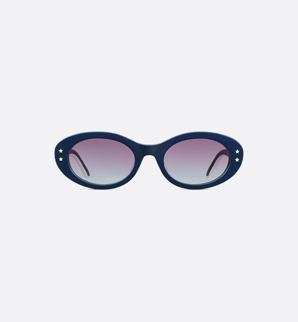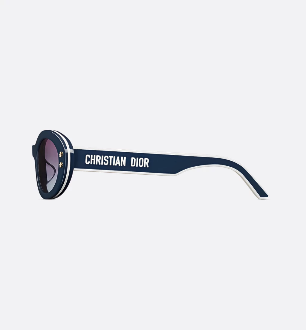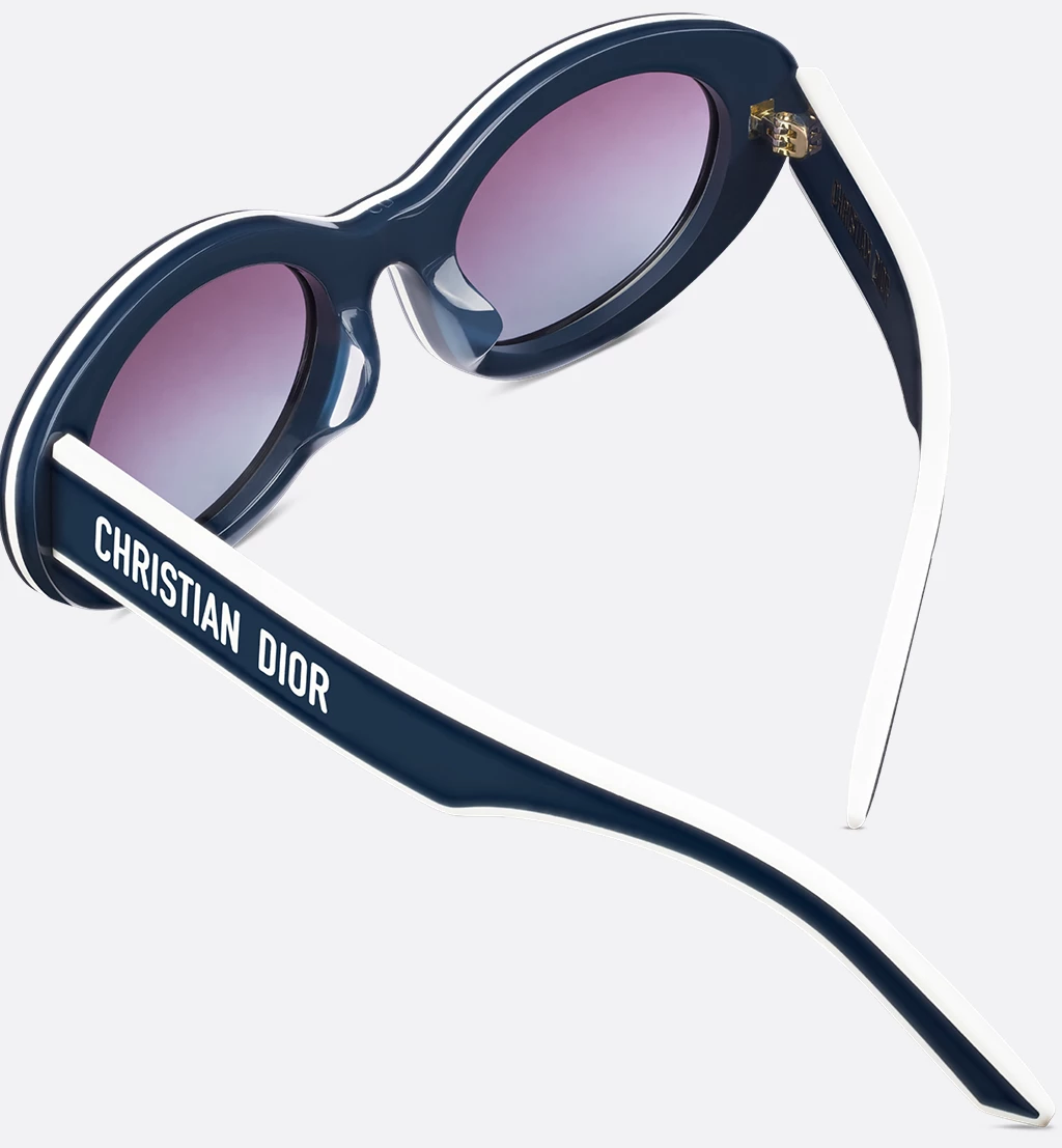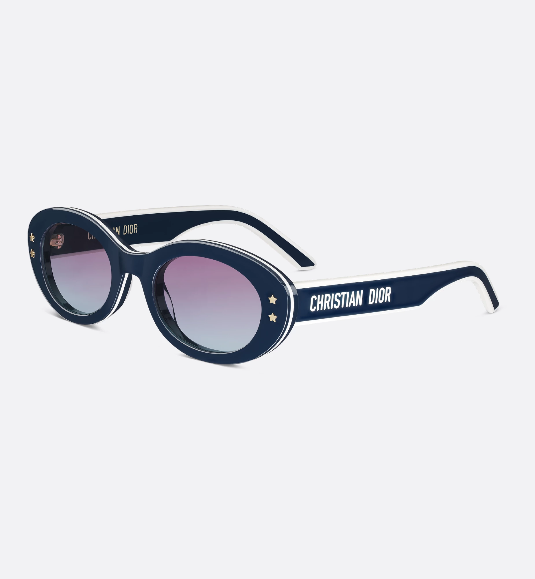 The DiorPacific B4I sunglasses are a modern low oval design. The blue triple-layer effect acetate frame is adorned with gold-finish star details on the front, while the acetate temples present a blue and white double-layer effect, together with the Christian Dior signature. Completed by gradient purple-to-blue lenses, the new essential style will lend a contemporary touch to any look.