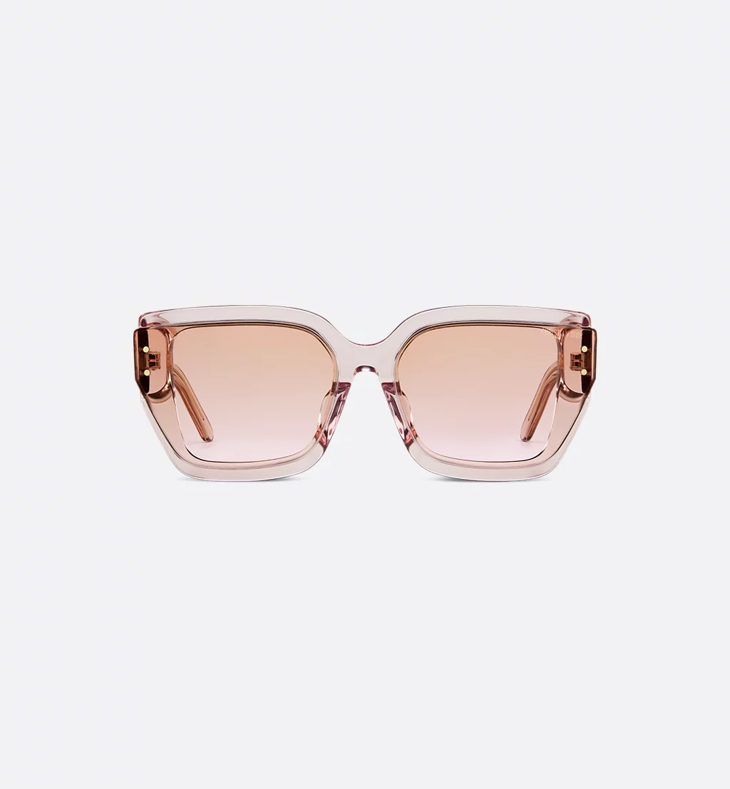 The DiorSignature S14I sunglasses elevate the iconic House line. The transparent pink square acetate frame features flush-set pink lenses with graphic appeal. The temples are adorned with the Christian Dior Paris signature framed by lines in gold-finish metal.