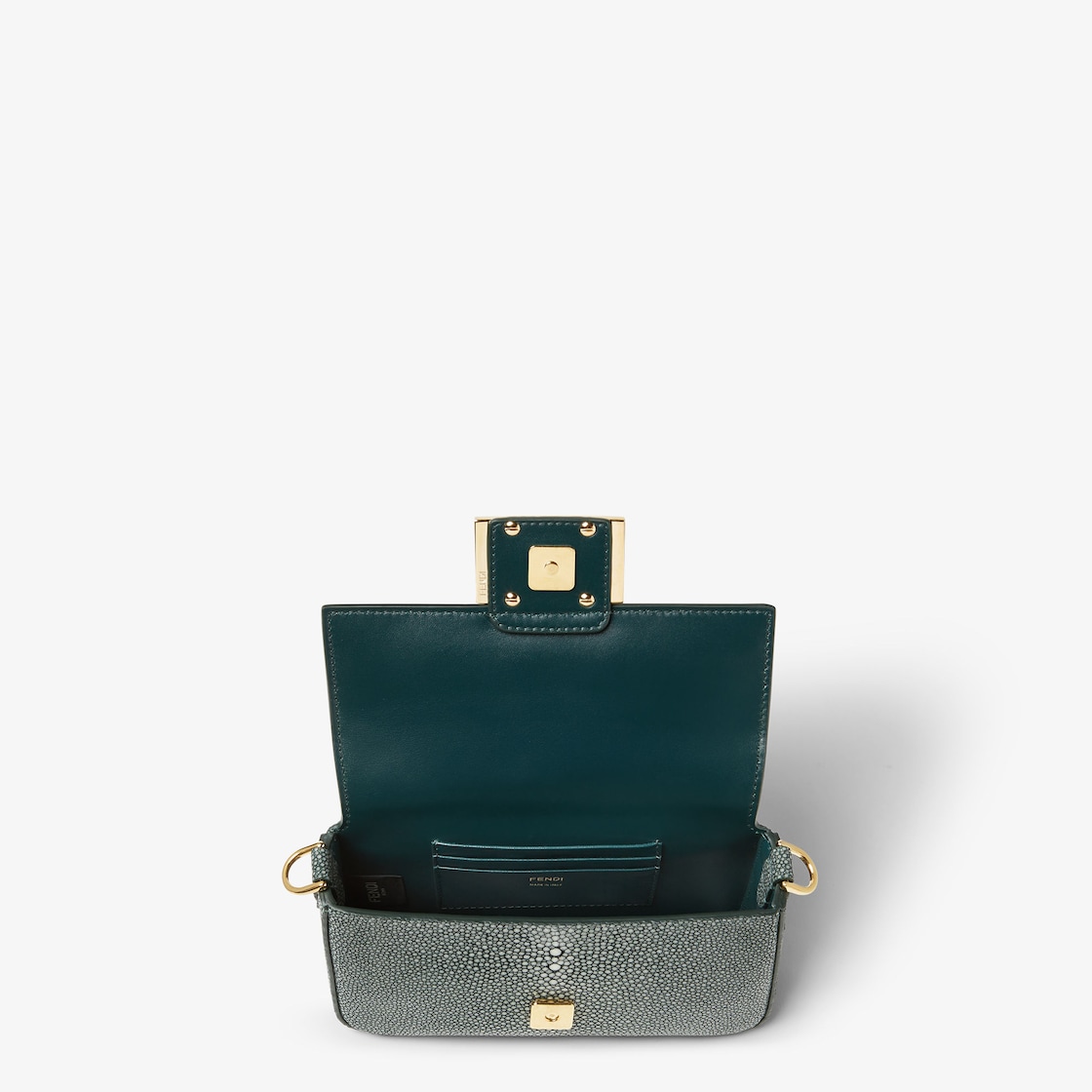 Iconic Baguette® mini-bag, made of fine hand-polished English green stingray leather. Decorated with an FF clasp.