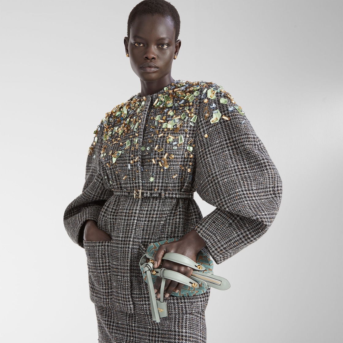 Made of jacquard velvet with a raised FF motif in matcha green on a beige base.