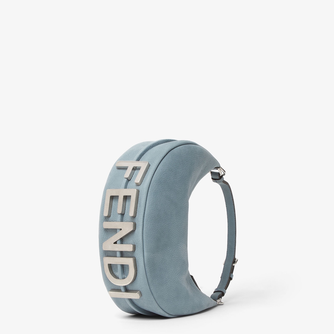 Made of mercury blue Cuoio Romano leather with a suede finish, calfskin with a characteristic natural grain produced with a metal-free tanning process. Embellished with FENDI lettering in vintage palladium finish metal on the base, visible when the bag is worn under the arm.