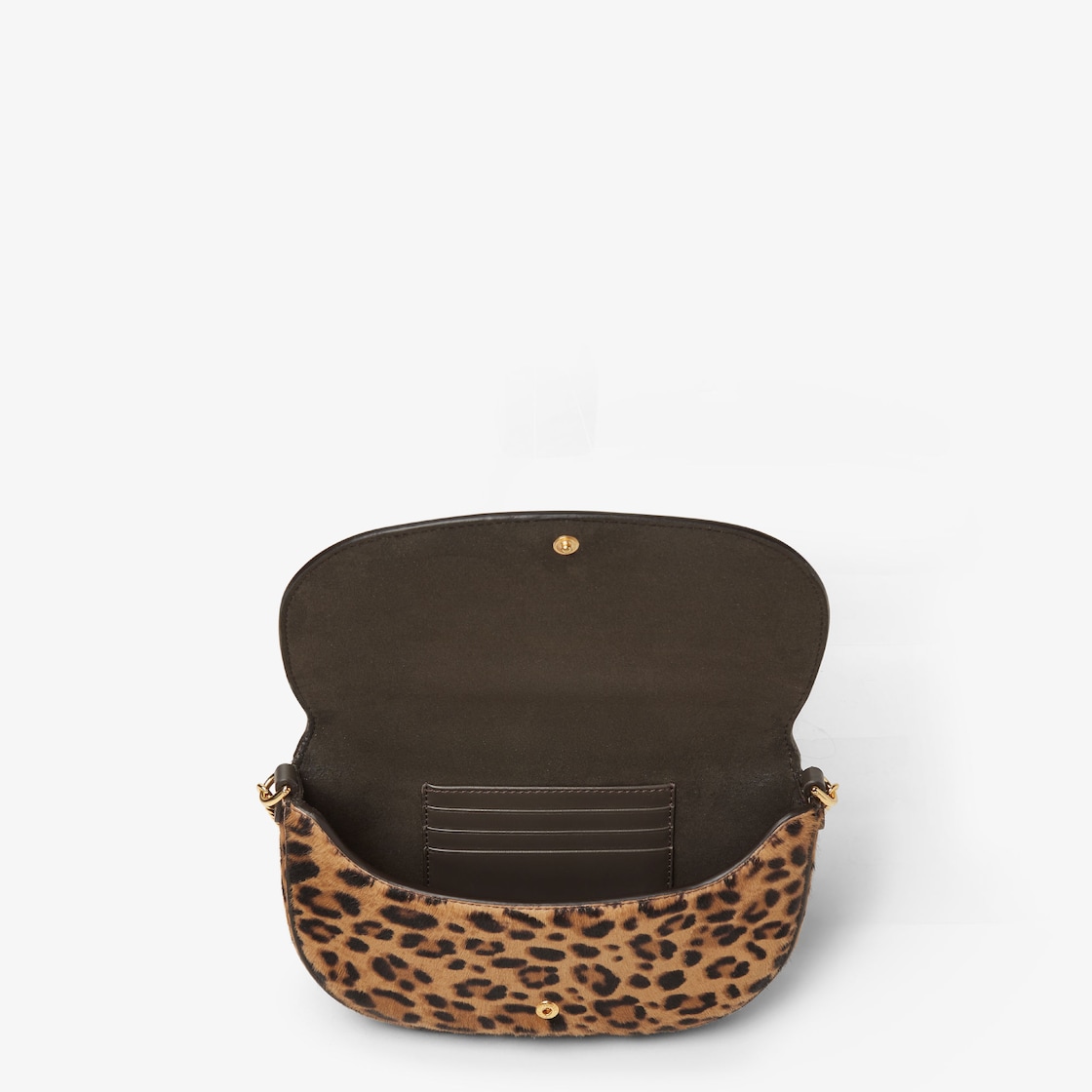 Fendigraphy wallet with flap decorated with metal Fendi lettering. Features a lined internal compartment with four card slots. Short, thin chain shoulder strap and second removable shoulder strap in leather and chain. Made of cavallino calfskin, with brown Fendi Leo pattern. Gold-finish metalware.