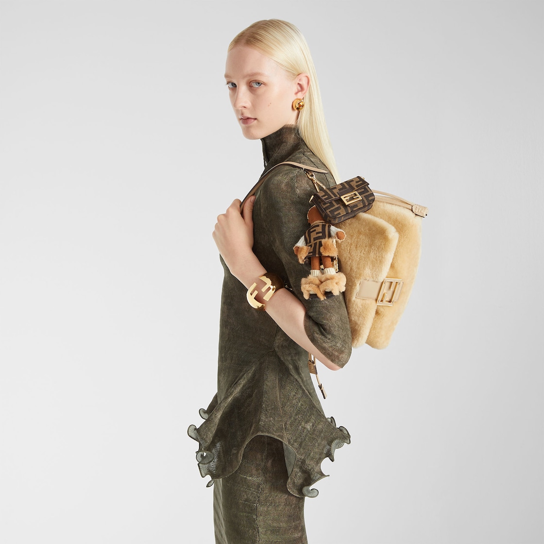 Made of soft beige shearling, decorated with FF closure with beige leather insert.