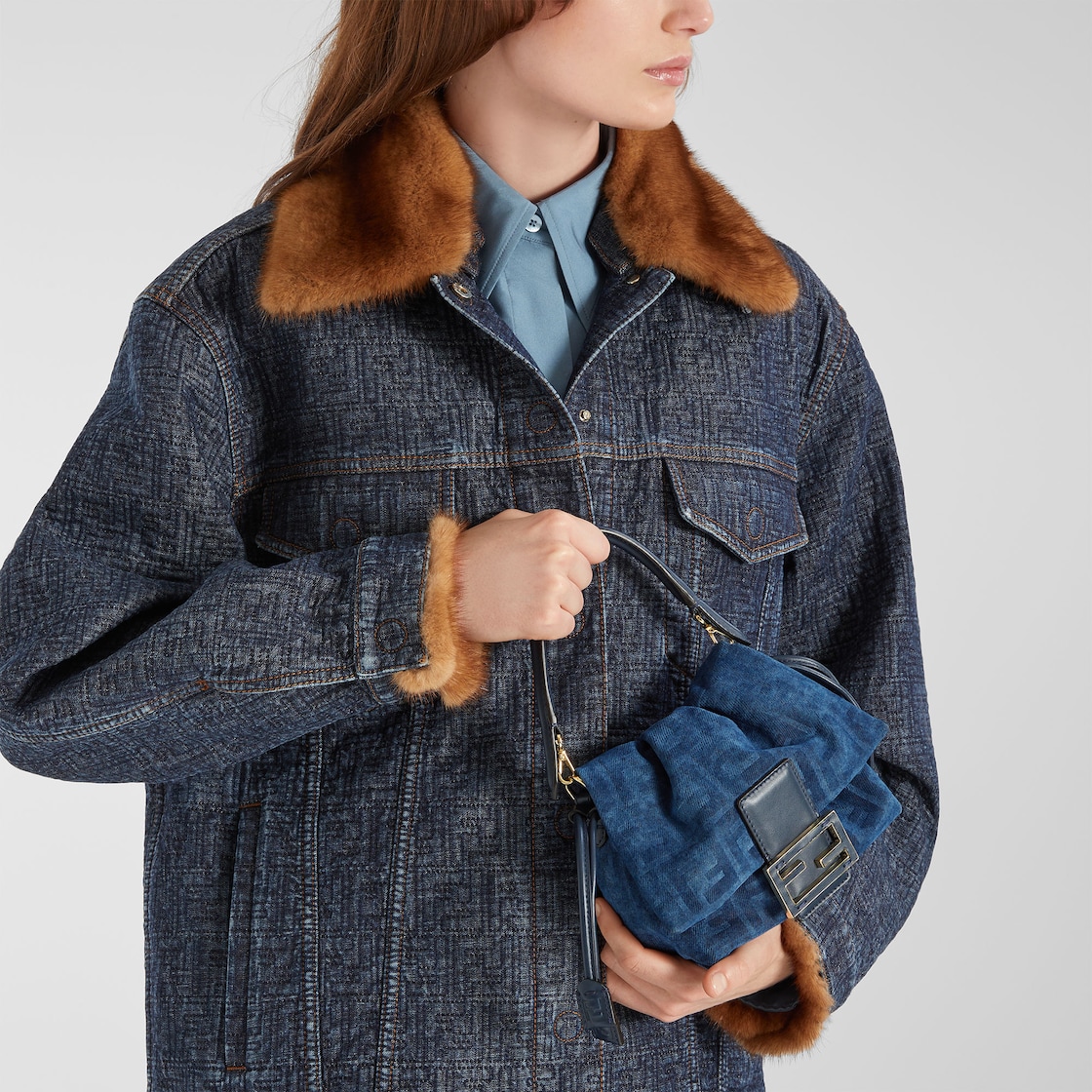 Made of blue FF denim with a flocked texture. Embellished with an FF clasp with dark blue leather insert.