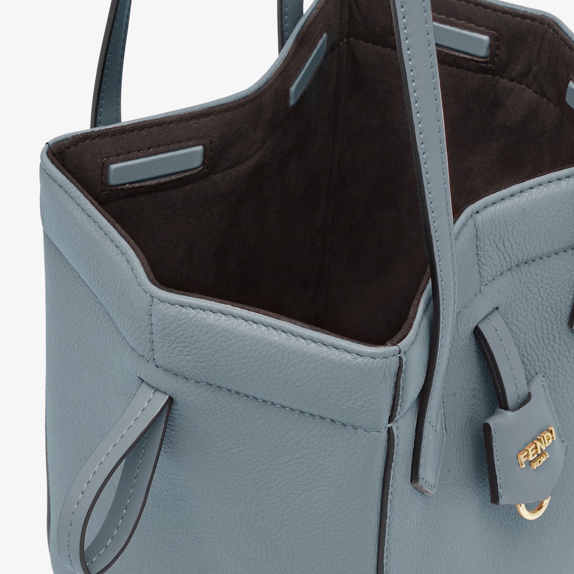 Mini Origami bag made of blue full-grain leather. The style recalls the dual nature and creativity of Fendi with an innovative design that can be transformed: the ingenious closure with eight magnets means the bag can be folded, origami-style, transforming it from a bucket bag – when the magnets come together in the middle with a magic clasp – into a shopper by gently pulling the short shoulder straps on each side.