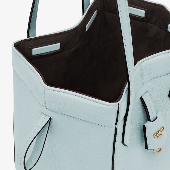 Mini Origami bag made of light blue full-grain leather. The style recalls the dual nature and creativity of Fendi with an innovative design that can be transformed: the ingenious closure with eight magnets means the bag can be folded, origami-style, transforming it from a bucket bag – when the magnets come together in the middle with a magic clasp – into a shopper by gently pulling the short shoulder straps on each side.
