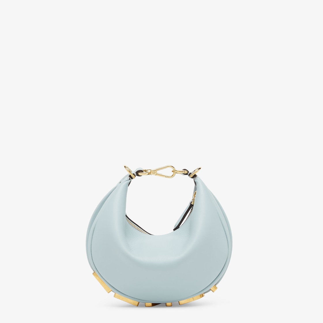 Mini hobo bag made of soft, light blue leather, embellished with vintage gold metal FENDI lettering.