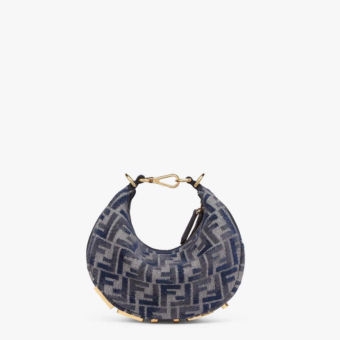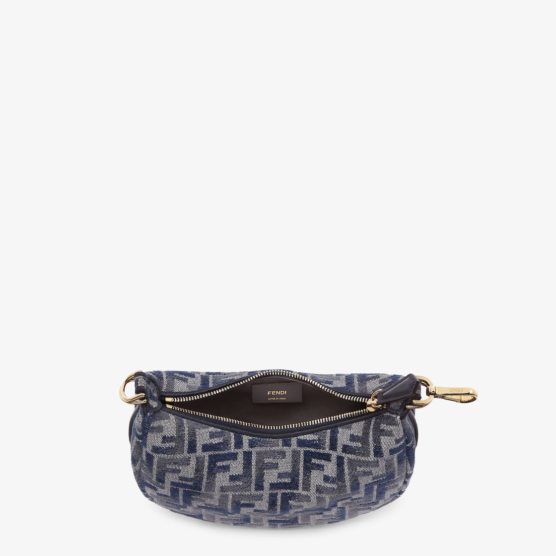 Made of chenille with the iconic FF motif in dark blue, decorated with vintage gold-finish metal FENDI lettering on the base, visible when the bag is worn.