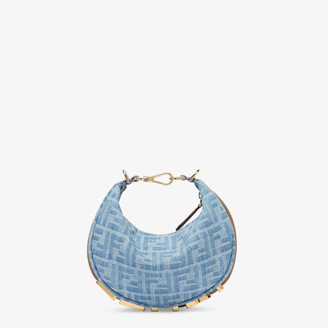 Mini Hobo bag made of denim-effect, light blue fabric with an FF motif. Embellished with vintage-gold metal Fendi lettering.
