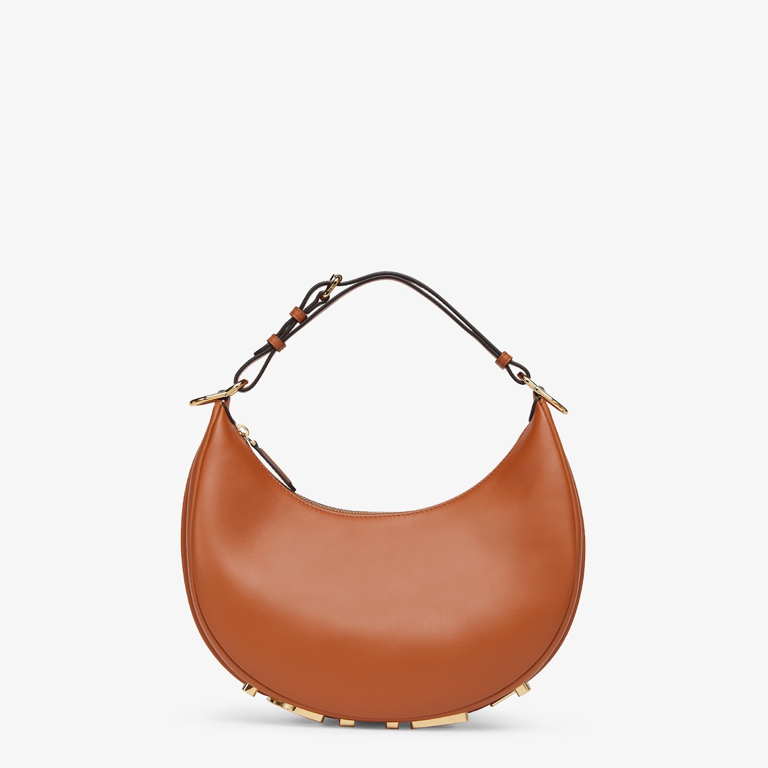 Small hobo bag made of supple brown leather, decorated with vintage gold metal FENDI lettering visible when wearing the bag under the arm.