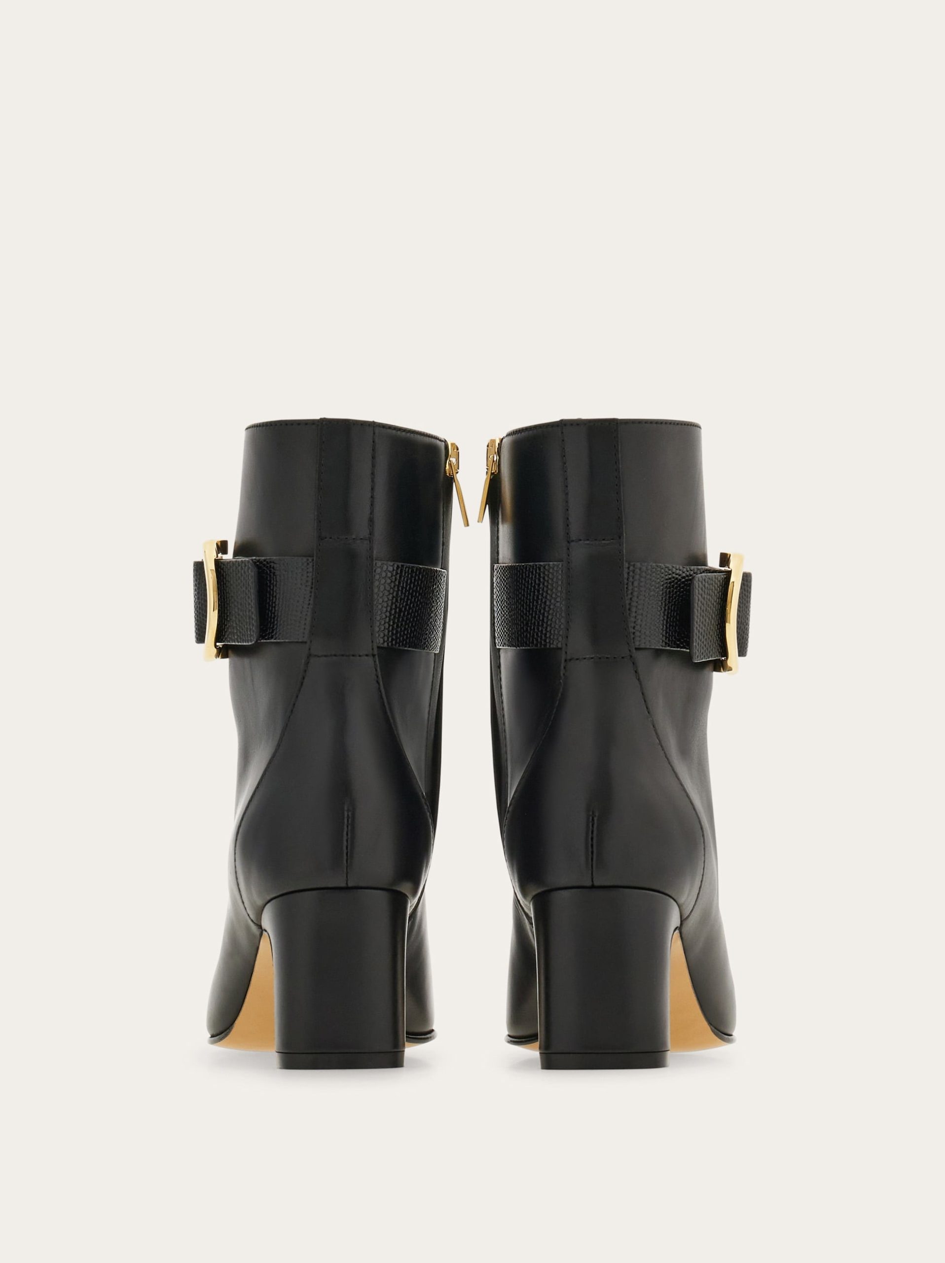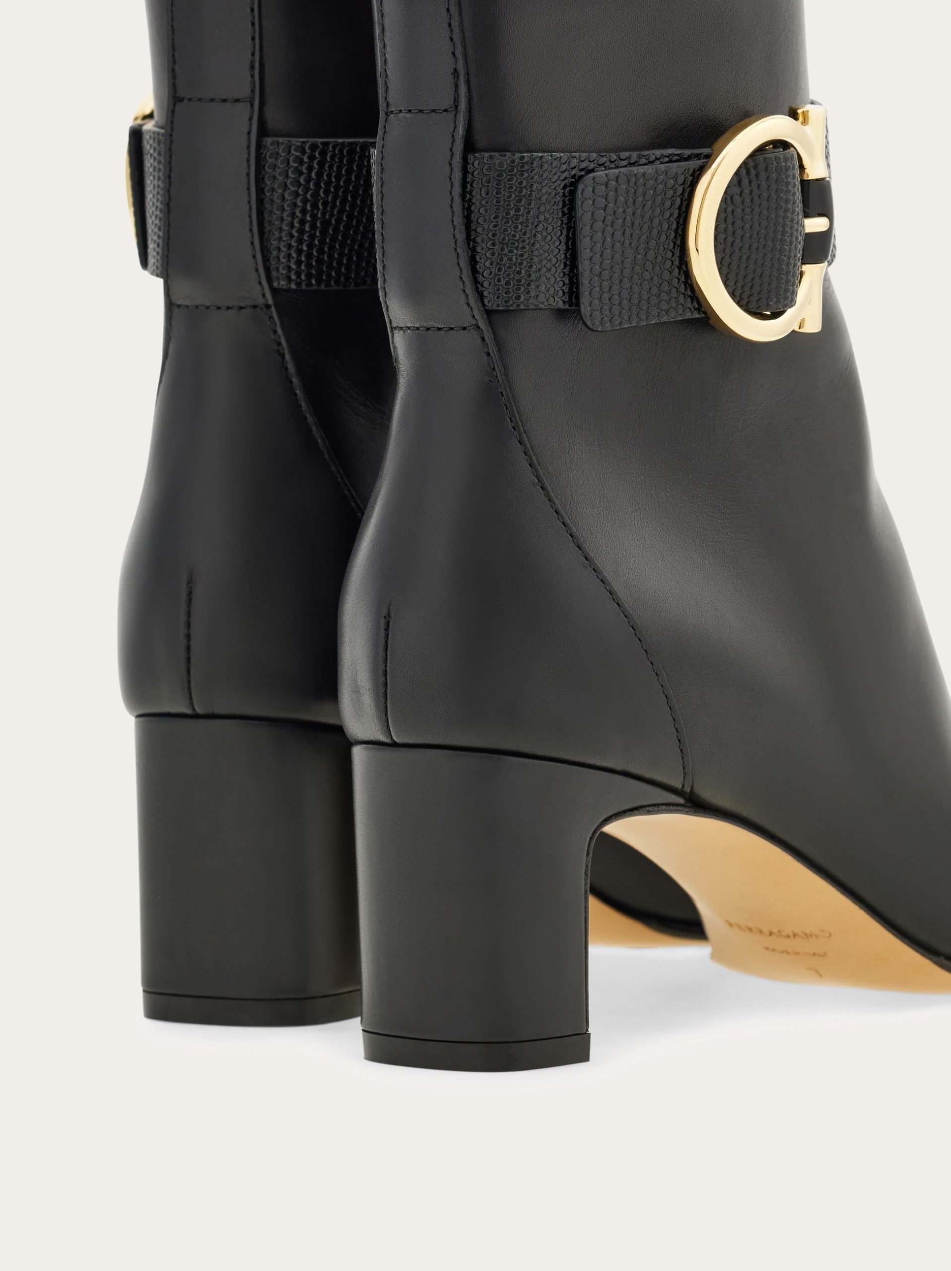 Smooth and buttery soft, the minimal, clean cut look of this sleek ankle boot is accentuated by meticulously placed details. The calfskin upper features a lizard print strap that wraps the ankle and fastens via a golden Gancio buckle. A zip on the inside of the ankle ensures a glove-like fit, while the 5.5cm chunky heel offers all day comfort.