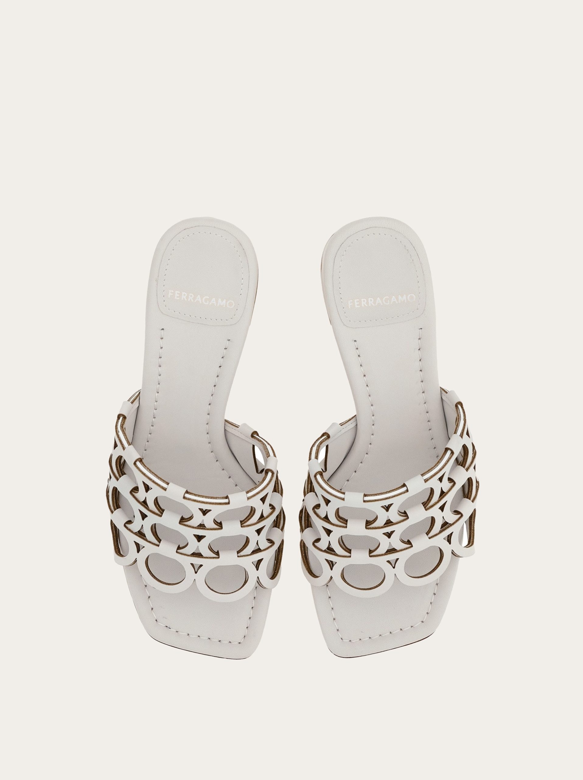 Expertly woven from soft calfskin leather, the upper of this new Ferragamo sandal is a celebration of the iconic Gancio outline. The chunky covered heel adds a modern twist and a comfortable fit.