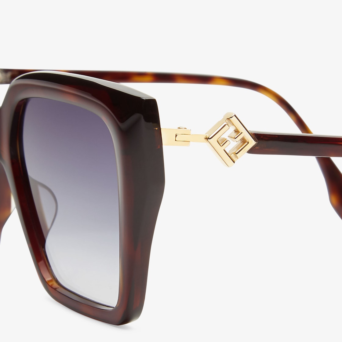 Oversized square FF Diamonds glasses in Havana acetate. Temples with functional FF Diamonds hinges in gold-colored metal. Blue gradient lenses.