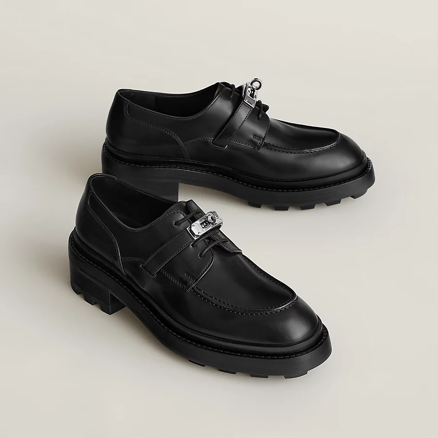 Oxford shoe in glazed calfskin with functional palladium-plated Kelly buckle and notched sole.