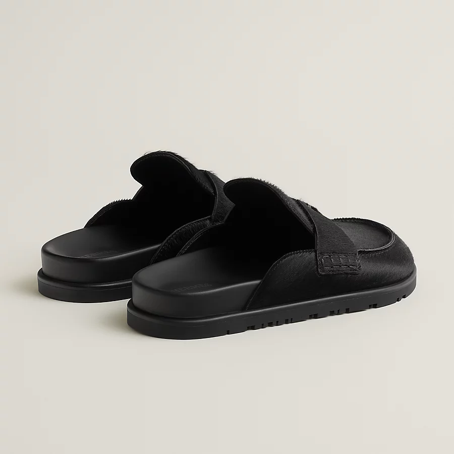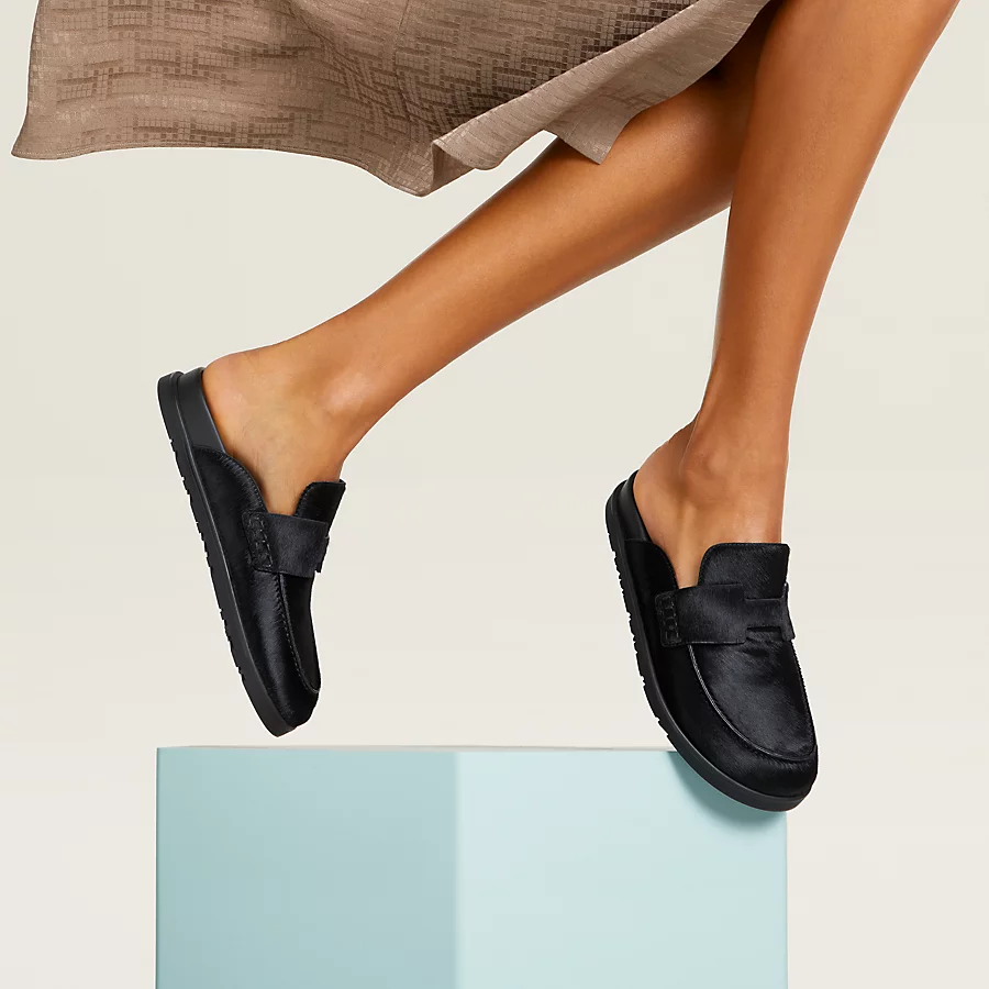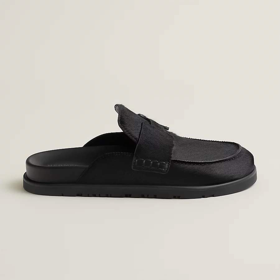 Mule in moire calfskin with iconic “H” cut-out detail.