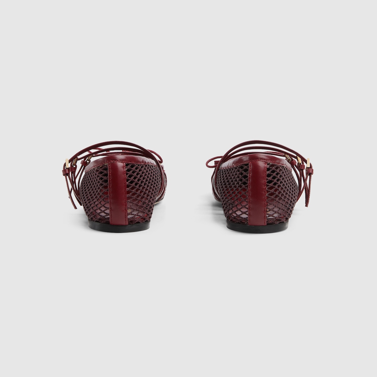 This iconic Horsebit ballet flat pays homage to the original ballet shoe silhouette defined by a squared tucked toe cap and the delicate bow detail. This style is crafted in Gucci Rosso Ancora red mesh. The “sacchetto” construction ensures a high level of comfort, thanks also to the soft padded insole.