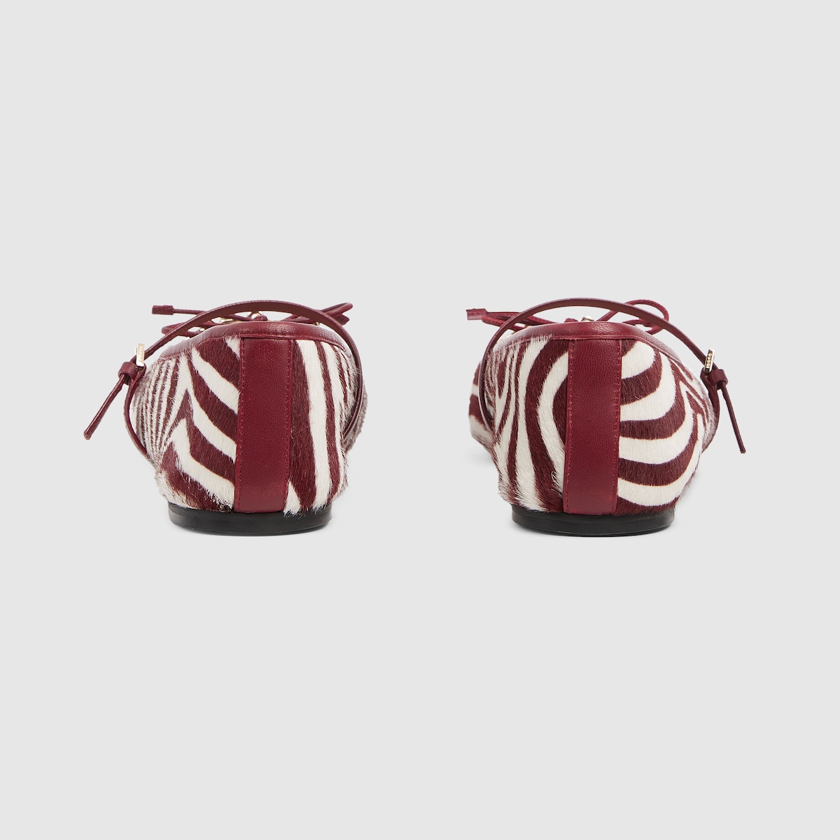 This signature Horsebit ballet flat pays homage to the original ballet shoe silhouette defined by a squared tucked toe cap and the delicate bow detail. This style is crafted calf hair and defined by a light gold-toned Horsebit. The “sacchetto” construction ensures a high level of comfort, thanks also to the soft padded insole.
