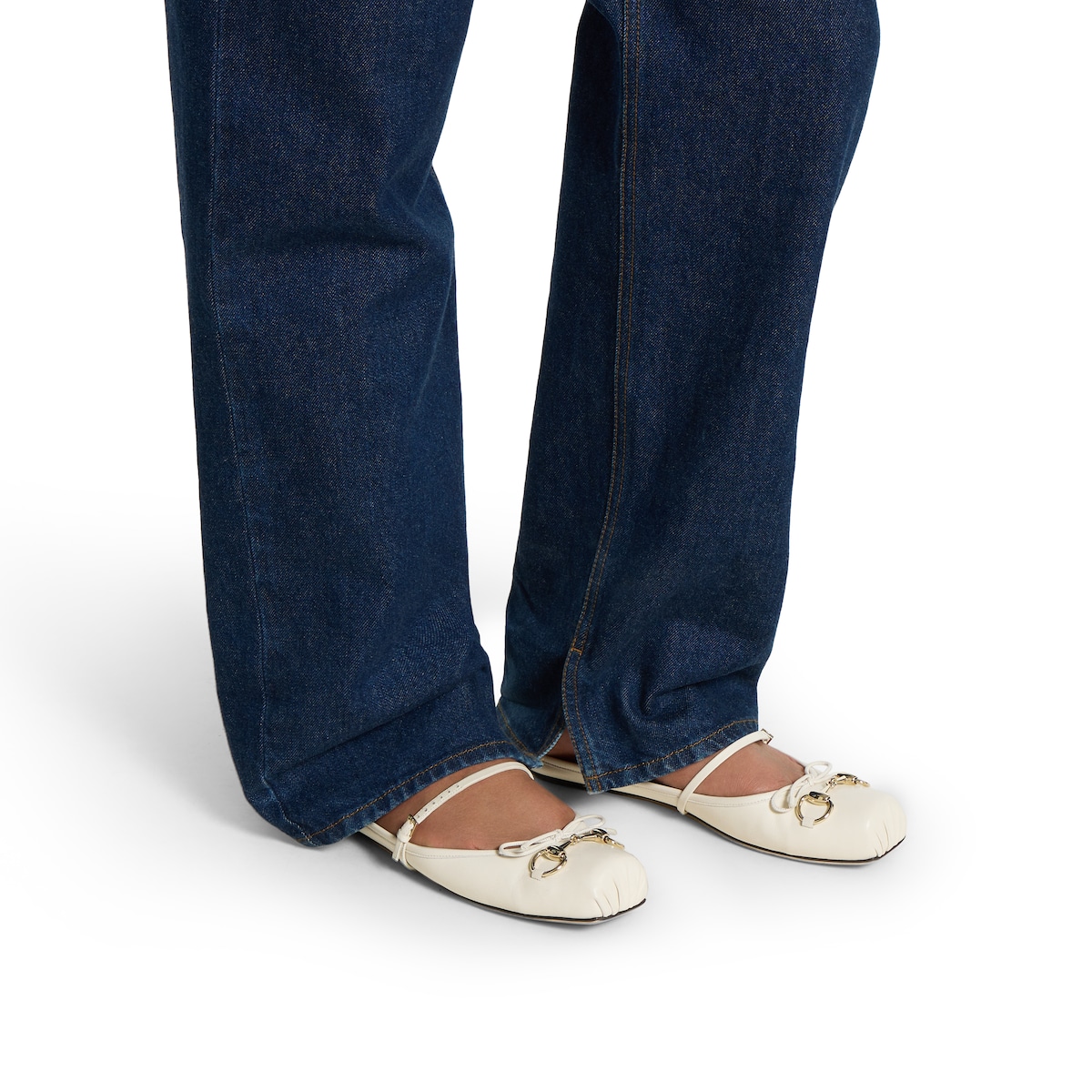 In the Fall Winter 2025 collection, this Horsebit ballet flat mule pays homage to the original ballet shoe silhouette defined by a squared tucked toe cap and the delicate bow detail. This style is crafted in leather and defined by a light gold-toned hardware. The “sacchetto” construction ensures a high level of comfort.