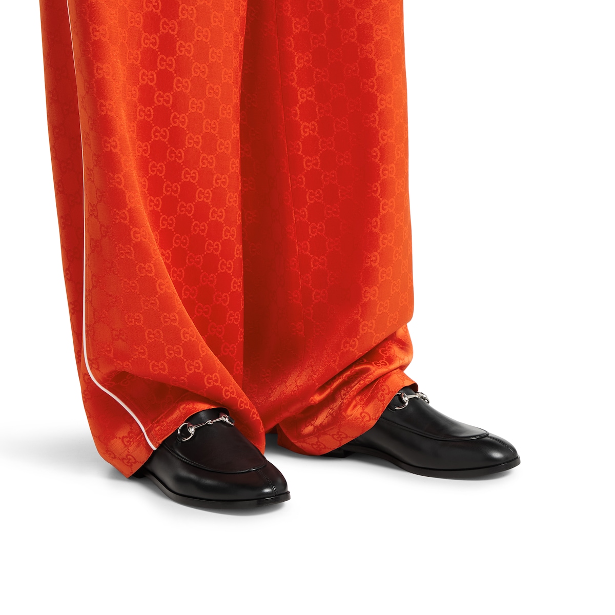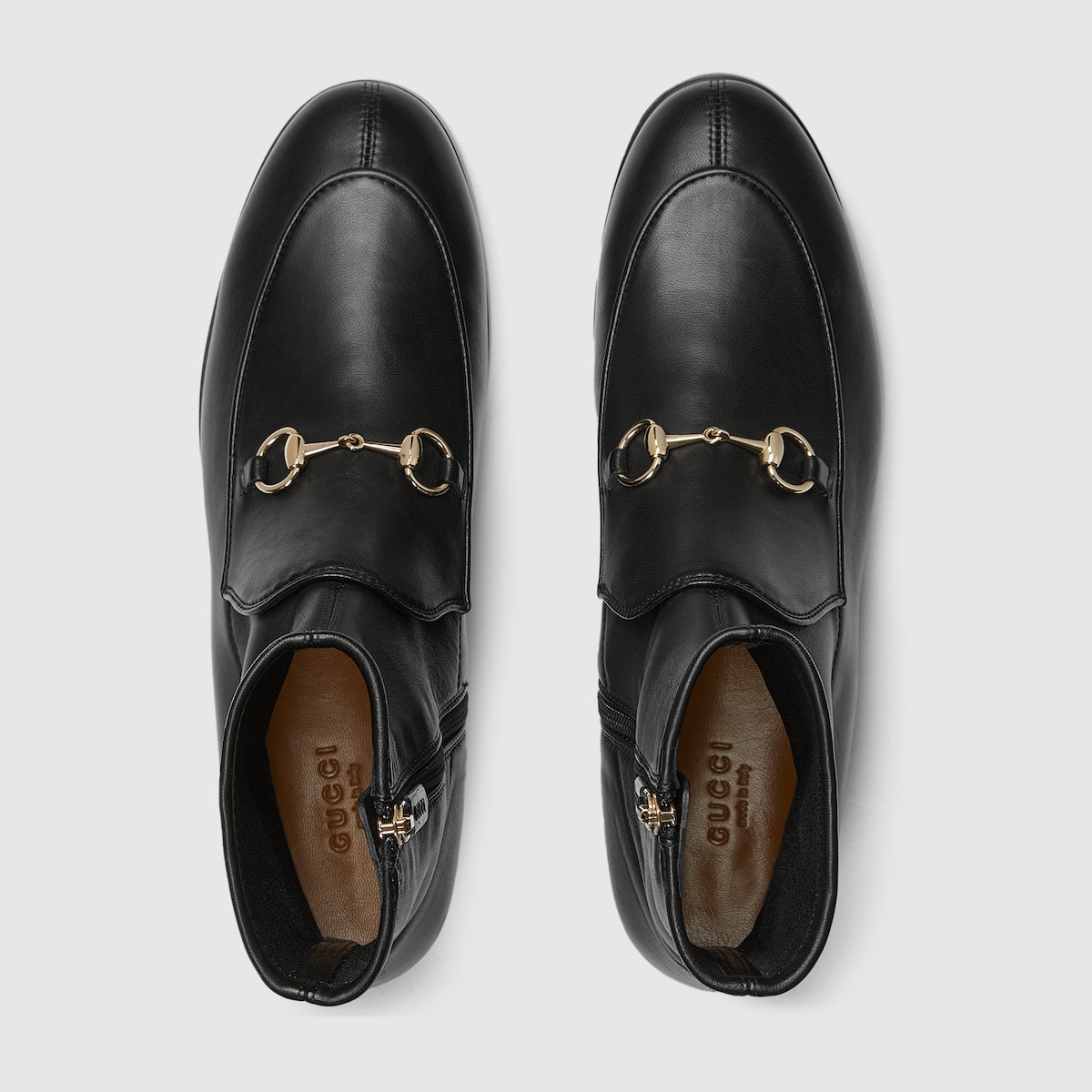 The Gucci Jordaan loafer is a key silhouette that spans across seasons. A classic shape that here is presented as an ankle boot, crafted from smooth leather and enhanced by a light gold-toned Horsebit.
