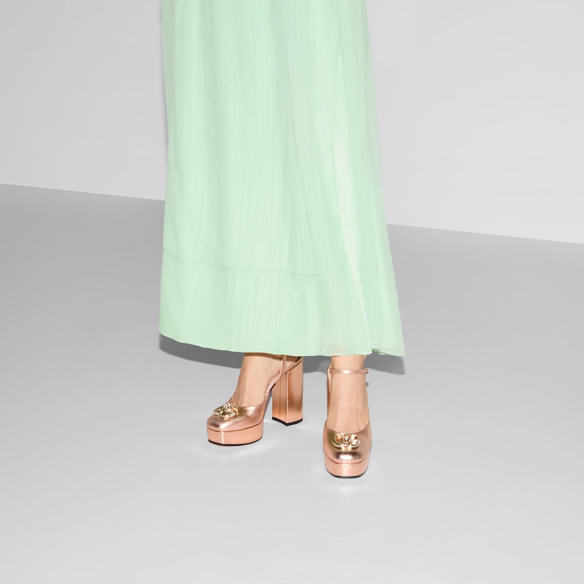 The line presents an elegant range of signature styles designed to celebrate beautiful night skies, with metallics, sparkling details and delicate color palettes. This pump is crafted in metallic leather and features the Double G logo with crystals.