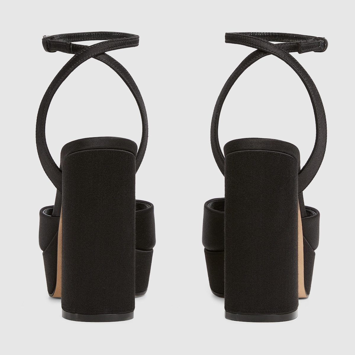 The signature Horsebit defines this pair of elegant satin sandals with a sparkling crystal finish. A platform high heel and the adjustable buckle closure complete the style.