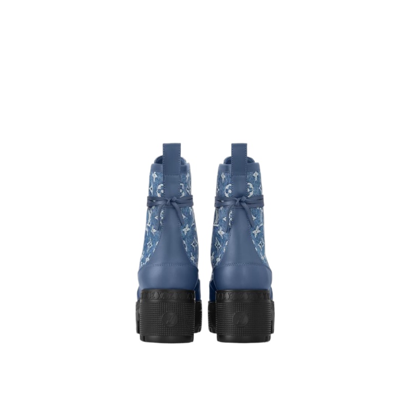 The iconic Laureate platform desert boot is revisited in bleached Monogram denim with coordinating leather trim. On the tongue, a natural leather label is embossed with the Louis Vuitton signature. The treaded rubber outsole, which matches the upper, is decorated with a row of LV Initials inspired by the lozine edging of the House’s historic trunks.