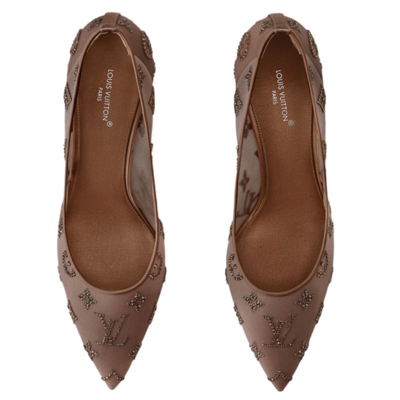The Gala pump is an elegant, evening-ready style in mesh embroidered with sparkling rhinestones, which form the iconic Monogram pattern. The sleek lines of the upper are complemented by a slender stiletto heel, while the fine leather outsole is embellished with an LV Initials accessory in gold-toned metal.