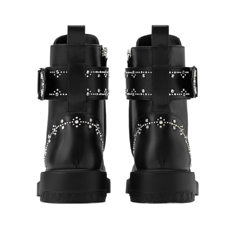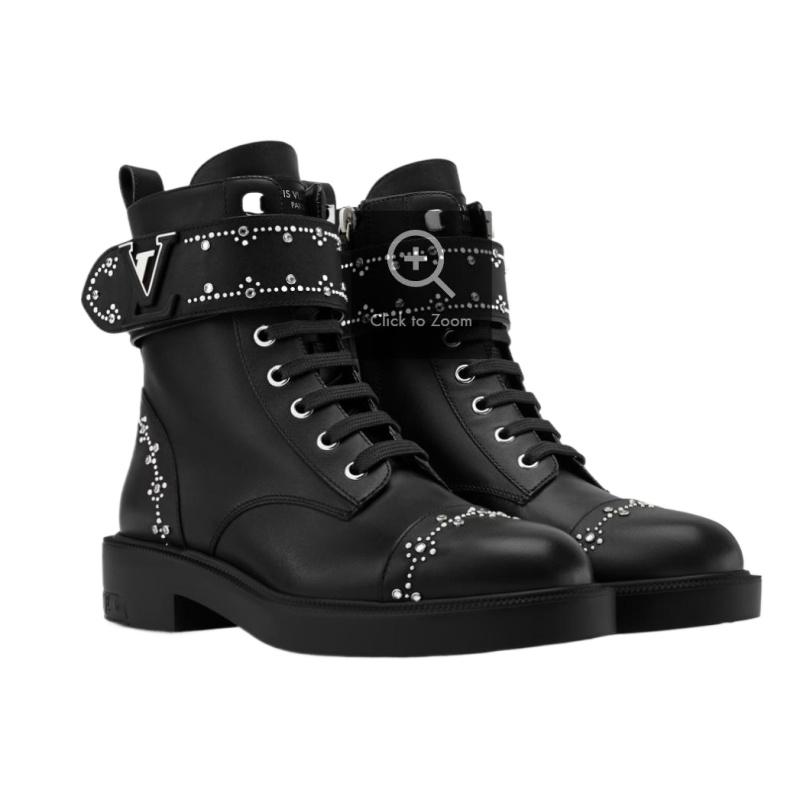 The Citizen flat ranger boot returns this season in smooth calf leather embellished with intricate patterns of small, silver-toned studs. In addition to laces, this military-inspired ankle boot has an adjustable velcro strap with a partially leather-covered LV Initials accessory, referencing the iconic Capucines bag. It is finished with a rubber outsole.