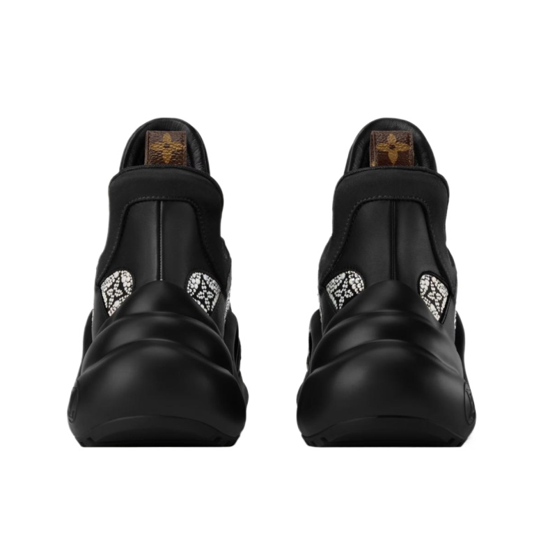 This exceptional edition of the LV Archlight sneaker is covered in glittering rhinestones recreating the Louis Vuitton Monogram pattern. The bouncy, wave-shaped outsole, which is a key feature of this cult design, comes in black rubber for an elegant look. Both the tongue and outsole are signed with an LV Circle motif.