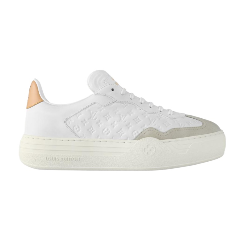 The LV Groovy platform sneaker comes in soft calf leather, which is debossed with Louis Vuitton’s iconic Monogram pattern. This model combines a Seventies-inspired upper with an oversized, elevated outsole. Key details include the Monogram Flower lace accessory, the natural leather trim at the back, and the specially designed Louis Vuitton signature on the tongue.